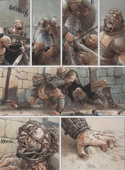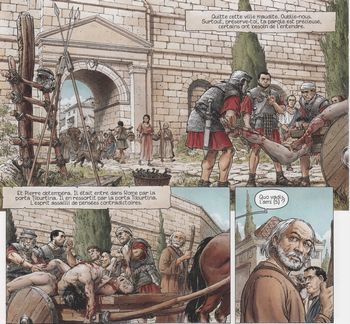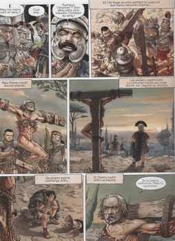 remarques: | et Néron dit: telle sera ma cité (Neropolis), celle qui renaîtra de ses cendres début du 3ème cycle qu'on pourrait appeler le cycle de Neropolis Pierre revient à Rome pour apporter sa pierre à la reconstruction tout comme Lucius Murena qui prend en partie la direction des travaux >> p. 5 tandis que le Besogneux (genre de Quasimodo) et Tigellin s'enrichissent avec les ruines de son côté, Massam fait courir la rumeur que c'est Lucius Murena qui a déclanché l'incendie en mettant le feu à un entrepôt d'huile alors que pendant ce temps, Claudia, fille de Ruffalo, chef de la garde de Néron, s'éprend de Lucius Murena >> p. 9 des juifs sont arrêtés mais selon Tigellin, les cachots ne demandent qu'à être vidés afin de les remplir à nouveau n.b. différence entre juifs et chrétiens appelés "chrestiani" par Tacite Poppée prend la défense des juifs mais Tigellin insiste pour les condamner comme incendiaires afin de trouver un bouc émissaire pour le bon peuple et même le sage Sénèque admet ce point de vue >> p. 12 la dernière rencontre de Pierre avec Néron et après que Néron ait signé l'ordonnance, commence le martyr des chrétiens tandis que Néron en profite pour faire commencer les travaux de construction pour sa nouvelle villa (la sienne a été complètement détruite durant l'incendie), ce sera la domus Aura = la maison dorée >> p. 17 description de la villa dorée commencée avec un luxe inouï mais qui restera inachevée Pierre est également arrêté et Tigellin agit avec grand zèle contre les adorateurs du Nazaréen, Lucius Murena veut faire connaître la vérité à Néron pour épargner la vie de nombreux innocents mais Tigellin n'a aucun intérêt à changer le cours des évènements et se prépare à faire supprimer Lucius Murena par la même occasion, Ruffalo veut éliminer Massam pour préserver la vie de Murena et c'est Balba qui va s'en charger >> p. 23 à 28 le duel final entre Massam et Balba Balba en sort vainqueur mais il doit encore se défendre contre la panthère noire de Massam, sur le point de succomber, il est sauvé par Ruffalo, toutefois Balba ne survivra pas à ses blessures et meurt en présence de Lucius Murena >> p. 36/37 la crucifixion de Pierre (avec des épines mais pas la tête en bas!) Pétrone réussit à convaincre Néron de rencontrer Lucius Murena qui a une révélation importante à lui faire mais Lucius est déjà menacé par Tigellin et son Besogneux >> p. 43 les mets délicats à la mode dans les festins romains dont des épines en forme de pâtisserie n.b. à Rome trois repas par jour: jentaculum = petit-déjeûner, prandium = collation de midi et cena = repas du soir >> le graphisme de Delaby avec son trait très affiné reste toujours encore respectable, malheureusement le scénario de Defaux manque beaucoup de vigueur et n'est plus à la hauteur du graphisme, la mort de Delaby en janvier 2014 va beaucoup influencer la continuation de la série et à ce jour (novembre 2014) aucune suite n'est annoncée et ce ne sera pas facile de remplacer un aussi bon dessinateur que Delaby citation au 4ème plat: "souviens-toi que tout en ayant une nature mortelle et disposant d'un temps limité, tu t'es élevé grâce aux raisonnements sur la nature jusqu'à l'illimité et à l'éternité et que tu as observé ce qui est, ce qui sera et ce qui a été" Métrodore, lettre à Ménestrate (78 AC) Annexes - couverture de l'album original - couverture d'une édition spéciale |
