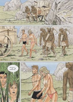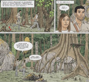 remarques: | la suite des naufragés-survivants après deux jours de marche, le deuxième groupe de survivants quitte la jungle et s'engage dans une sauvage savane qui doit les conduire à une zone habitée >> p. 5 un arrêt pipi compliqué on retrouve les affaires du premier groupe dispersés et un cadavre qui ne sera pas enterré >> p. 11 laissons faire la nature dixit Manon, cheffe du groupe (exprimant à nouveau les sentiments quelque peu anti-religieux de Leo) rencontre avec une troupe de guerriers sauvages qui ont capturé deux membres du premier groupe: Shirley et Goran >> p. 15 Manon d'un air décidé abat les 5 guerriers avec son revolver mais Goran reste sur le carreau par contre un gentil extra-terrestre de race supérieure emprisonné, est délivré, il s'appelle Antac, il est venu d'un autre monde et comme les terriens s'est aussi échoué sur la planète avec ses compagnons dont il a été séparé >> p. 22/23 l'histoire de Manon, une nana canon (+ petit exposé sur l'utilité des entraînements) puis l'équipe continue sa progression mais s'étant écarté du groupe, Manon et Alex constatent qu'ils sont sujets d'étranges phénomènes atmosphériques dont des distorsions dans le temps, ils pensent alors que les naufrages intervenus sur cette planète sont l'oeuvre d'anomalies quantiques d'où l'explication sur les différents degrés de civilisation rencontrés, tous ces différentes races étant des naufragés involontaires de différentes planètes Manon et Alex subissent maintenant des perturbations temporelles (des sauts dans le temps) de différentes intensités selon l'endroit où ils se trouvent, il sont séparés de leur groupe dans le temps et ne rejoindront deux de leurs compagnons au même endroit que 6 ans plus tard alors que la distorsion du temps n'a duré que quelques secondes! le quatuor pénètre ensuite dans une agglomération peuplée de nombreuses races où ils retrouvent trois autres compagnons (les explications à ce propos seront données dans le prochain album) >> la suite de l'histoire des naufragés de l'espace laissés à eux-mêmes sur une planète inconnue et confrontés également à des perturbations temporelles d'où différence fondamentale avec les trois premiers cycles qui s'occupaient principalement du thème de la colonisation Leo s'attaque maintenant aux phénomènes inter-temporel ou voyage dans le temps mais Leo n'y est pas encore bien à l'aise et ses changements temporelles ne sont pas très convaincants car ils manquent de cohérence la trame du récit ne change pas beaucoup avec un texte peut'être un peu plus élaboré, mais toujours populiste s'occupant beaucoup des relations inter-humaines et inter-sexuelles, idem pour le graphisme |