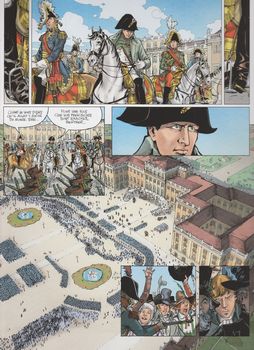remarques: | chapitre V seconde journée (suite) la cavalerie, pour protéger la retraite, charge à nouveau malgré l'épuisement complet des hommes et des chevaux, c'est un hécatombe et le ravitaillement s'effectue au ralenti >> p. 11 à la Tuilerie, quartier-général de Napoléon "la victoire tient à rien: un retard, un coup de vent, un caprice d'un fleuve, etc " dixit Napoleon (n.b. et pourtant le génie de Napoleon devrait y être pour quelque chose) à Essling, point stratégique important, Boudet est attaqué par les autrichiens et demande des renforts, Lannes tient encore une partie de la plaine façe à Rosenberg, mais il est gravement blessé, Dorsenne arrive en renfort mais subit de lourdes pertes >> p. 17 de la chair à canon au crépuscule, l'armée se replie sur l'île de Lobau, Masséna exécute une retraite en bon ordre, Lannes meurt dans les bras de Napoléon en l'exhortant à cesser la guerre chapitre VI seconde nuit >> p. 22/23 description du caractère de Napoléon qui demande conseil à Masséna et qui dicte ses ordres à Berthier Napoleon se rend par barque en pleine nuit à Schönbrunn tandis que dans la plaine, les infirmiers récupèrent le cuirassier Fayolle laissé pour mort qui se suicidera peu après >> p. 31 la traversée du Danube par l'île Lobau à Vienne, les autrichiens célèbrent déjà une possible victoire sur Napoléon, Mademoiselle Krauss fausse compagnie à son petit ami Lejeune, mais la retraite française s'est bien effectuée en 6 heures, une belle performance chapitre VII après l'hécatombe >> p. 39 Napoléon qui a de l'eczéma quand on lui annonce de mauvaises nouvelles >> p. 41 Lejeune se lamente sur la perte de sa petite amie Krauss; Périgord, son collègue-officier, lui recommande un séjour aux eaux de Baden (Baden-Baden?) >> p. 43 la parade militaire de Napoléon à Vienne Staps échoue dans sa tentative d'assassiner Napoléon >> p. 46 le façe-à-façe entre Napoléon et son assassin-amateur >> p. 48 la nouvelle conquête de Lejeune tandis que Napoléon planifie déjà sa prochaine campagne: ce sera Wagram de profundis, la destinée de certains personnages de la trilogie: - Lejeune quittera l'armée et se vouera entièrement à la peinture - Berthier, prince de Neuchâtel et de Wagram, il meurt à l'arrivée de Napoléon depuis l'île d'Elbe - Masséna, prince d'Essling, disgrâcié, il est nommé gouverneur de Paris après Waterloo, il meurt 8 ans après la bataille d'Essling, - Henri Beyle écrira son roman "le rouge et le noir" sous le pseudonyme de Standhal - Bessières, tout comme Lasalle, sera tué en 1813 durant la campagne de Saxe - discussions sur les albums historiques - une prochaine série est prévue: "il neigeait" (sur la campagne de Russie) >> à nouveau un très bon album tant pour le scénario, le graphisme et le coloriage mais moins bon que le tome 2/3 (une fin un peu brodée après la bataille) dans cet album, on met surtout l'accent sur les horreurs de la guerre et sur les pertes humaines inutilement causées par la machine de guerre napoléonienne |