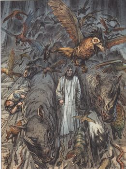 remarques: | un pavé biblique de 262 pages = un intégrale de 4 volumes 1) pour la cruauté des hommes le cycle Adam, Eve, Abel et Caïn Noé, sa femme Naameh (dont le nom n'est pas mentionné dans la bible), ses fils Sem et Cham et le bébé Japhet font partie du peuple épargné, car Dieu a décidé d'exterminer les hommes sur la terre mais déjà Noé protège les animaux de la cruauté des hommes >> p. 12 et 22 les premières visions de Noé sur le déluge >> p. 24 Bab-Ilim, la cité de la débauche les habitants ne veulent pas écouter Noé et Akkad, leur roi, menace même Noé et sa famille Ila, la jeune fille, est secourue par Noé et rejoint la famille; pour échapper à Akkad et à ses guerriers, Noé pénètre dans une région inconnue >> p. 41 les anciennes portes (une civilisation inconnue) >> p. 43 les gardiens des portes: les géants = héros des temps jadis, des hommes de renom (mentionnés dans la bible) ceux qui descendirent sur terre pour aider les hommes, mais Dieu n'apprécia pas cette action, les géants perdirent leurs ailes et furent expulsés du domaine céleste par le créateur (n.b. on retrouve ce thème dans la mythologie grecque) >> p. 50 l'histoire des géants racontée par Og, le géant, qui devient l'ami de Noé Noé avec Og et sa famille arrivent au mont Ararat où Noé reçoit de son grand-père une graine qui fait pousser une forêt >> p. 63 fais-toi une arche en bois résineux dit le créateur (mentionné dans la bible Genèse 6:13) 2) et tout ce qui rampe >> p. 74 la construction de l'arche commence, Ila devient la femme de Sem, Noé rassemble maintenant les animaux par couple de deux, d'abord les oiseaux, puis les reptiles, les mammifères et les insectes sur la menace d'Akkad, Noé accepte de prendre quelques humains >> p. 84 on fait dormir les animaux dernière tentative du roi Akkad pour s'emparer de l'arche, Noé avec l'aide des géants réussit à les repousser et décide de ne pas accepter d'autres humains à son bord car le mal est en eux Noé se dispute avec son fils Cham qui s'enfuit et rencontre la jeune femme Na'Eltamuk avec qui il développe une liaison quelque temps plus tard, les larmes du créateur commencent à tomber >> p. 139 Noé est un homme comme les autres: on ment, on tue et on aime >> p. 141 dernier combat contre les guerriers d'Akkad 3) et les eaux envahirent la terre la bataille pour l'arche continue avec les géants qui protègent l'arche et quand un géant tombe en combattant, le créateur lui pardonne et le délivre en le reprenant dans les cieux, mais Noé refuse d'amener Na'Eltamuk sur l'arche enfin l'arche flotte et commence sa dérive sur les flots déchaînés "ce jour-là, les sources du Grand Abîme jaillirent et les écluses des cieux s'ouvrirent, la pluie tomba sur la terre 40 jours et 40 nuits" Genèse 7:11-12 Noé fut sans pitié et repoussa à l'eau les quelques naufragés humains qui cherchaient encore à s'agripper à l'arche, seul Akkad blessé réussit à s'introduire dans l'arche sans se faire remarquer >> p. 176-182 l'histoire de la création racontée par Noé à ses enfants et l'eau donna la vie et peut donner la mort les flots se calment et Noé peut se préparer à débarquer, mais il doit encore livrer un dernier combat contre Akkad réfugié dans l'arche, Noé est sauvé par son fils Cham qui finalement se réconcilie avec son père 4) celui qui verse le sang >> p. 209 l'arche a survécu aux eaux et la crue des eaux dura 150 jours et c'est à ce moment que Ila, la femme de Sem commença, elle aussi, à perdre les eaux et à accoucher de jumeaux mais selon les instructions du créateur, Noé ne doit pas laisser vivre d'autres descendants que ceux de sa famille, toutefois Dieu fut miséricordieux et laissa la vie reprendre son cours, Noé et les siens débarquèrent dans le Nouveau Monde Noé éleva un autel à l'Eternel, il offrit des holocaustes sur l'autel, l'Eternel sentit l'agréable odeur puis l'Eternel dit: "désormais je ne maudirai plus la terre à cause de l'homme, car les pensées du coeur de l'homme sont mauvaises dès sa jeunesse et je ne frapperai plus tous les êtres vivants comme je l'ai fait" (bible Genèse 8: 20-21) mais Dieu ne tint pas ses promesses 1) Dieu détruisit Sodome et Gomorrhe (Genèse 19: 27-29) 2) Josué fit comme l'Eternel lui avait dit: il coupa les jarrets de leurs chevaux et brûla leurs chars au feu (livre de Josuée 11:9) 3) Dieu voue souvent à l'interdit des peuples et des villes "va donc, frappe les Amalécites et voue à l'interdit tout ce qui leur appartient, tu seras pour eux sans pitié, tu feras mourir hommes et femmes, enfants et nourrissons, boeufs et brebis, chameaux et ânes" (l'Eternel à Saül, livre de Samuel chapitre 15:3) >> un album intégrale qui reprend les quatre volumes publiés séparément 2011-2014 se basant sur l'épisode du déluge et de l'arche de Noé dans la Genèse, mais sans mentionner l'enivrement de Noé après avoir pris possession du Nouveau Monde le récit reste assez fidèle au texte biblique mais y ajoute de nombreux interludes romancés, introduits probablement pour mettre en valeur le graphisme en agrandissant et élargissant la sphère de l'histoire, le scénario est plutôt sans grande originalité et le graphisme n'en est pas plus recherché malgré quelques planches bien exécutées avec surtout un bon coloriage n.b. grande ressemblance et récit probablement tiré du film du même nom (ou vice-versa) |