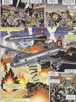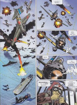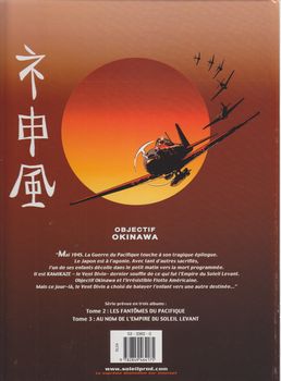 remarques: | 1944/1945, les japonais espèrent que le typhon appelé vent divin (kamikaze) qui avait anéanti la flotte d'invasion de Kubilaï Khan 700 ans auparavant se répéterait sur la flotte américaine 10.5.1945, un groupe d'aviateurs japonais se portent à la rencontre des américains, ces aviateurs se nomment alors aussi kamikazes, les pilotes de la mort >> p. 12 des pédés et un adorateur pacifiste de Bouddha dans le groupe de kamikazes >> p. 19 l'enfer sous les bombardements des colossales forteresses volantes B29 >> p. 20/21 l'officier japonais handicapé qui a perdu un oeil à Guadalcanal, un bras à Tarawa et une jambe à Saïpan >> p. 25 l'attentat perpétré par le Minshato (résistance socialiste clandestine) le 8.1.1945 n.b. peu connu des historiens l'amour et la quête de Yamashita pour sa petite amie Saïta, il découvrira un beau jour qu'elle est devenue une prostituée pour pouvoir survivre dans ce monde de ruines et de misère, par désespoir, Yamashita s'engage comme kamikaze >> p. 30 l'entraînement du futur pilote kamikaze le Japon est leur mère, l'empereur Hiro-Hito est leur père et le sabre du samouraï est leur sexe avec leur cri de guerre "banzaï" le grand voyage sur l'aile du vent divin vers Okinawa pour détruire les porte-avions américains >> p. 32 le bandeau avec le soleil levant noué autour du front = signe de grand sacrifice pour la patrie >> p. 36 le pilote pacifiste bouddhiste qui atterrit sur le pont d'un porte-avion américain en criant des paroles de paix, mais qui sera quand même abattu par les soldats américains le but de Yamashita est de s'écraser sur le porte-avion Enterprise, mais au dernier moment, Yamashita renonce à son sacrifice et veut survivre pour revoir Saïta, il réussira à échapper aux chasseurs américains et s'échoue sur un atoll près d'Okinawa >> un album assez intéressant, le scénario n'est toutefois pas très recherché par Mitton alors que Molinari se débrouille plutôt bien avec son dessin, mais l'album ne peut égaler l'excellent Kamikaze de Dimitri (voir sous section Dimitri) n.b. il y aura encore 2 autres volumes pour finir la série (mais non collectionnés ici): - tome 2 les fantômes du Pacifique (2007) - tome 3 au nom de l'Empire du soleil Levant (2009) Information mai 1945, la guerre du Pacifique se dirige vers son tragique épilogue, le Japon est à l’agonie, avec tant d’autres sacrifiés, l’un de ses enfants décolle dans le petit matin vers une mort programmée il est Kamikaze, le vent divin, dernier souffle de ce qui fut l’empire du soleil levant |