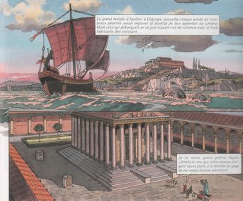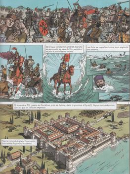 remarques: | album unique de la série, scénario: Gilles Chaillet, graphisme: Christophe Ansar - Rome 312 AC où Maxence règne par la terreur et se prépare à affronter Constantin et ses 40'000 soldats qui marchent sur Rome depuis Trèves, Constantin reçoit un soi-disant signe de Dieu "in hoc vince", mais qui est toutefois aussi un symbole germanique et Maxence est vaincu à la bataille du pont de Milvius - l'histoire de Dioclétien qui avait pris le pouvoir grâce aux légions et qui avait signé l'acte de persécution des chrétiens, Constantin, vainqueur, reconnait la religion chrétienne et veut récupérer le trésor des martyrs - en 286 AC, Dioclétien règne sur l'empire, mais ne veut pas règner seul, il prend l'Orient et cède l'Occident à Maximien Hercule, ils se nomment tous deux "auguste", ce sera la première tétrachie; Constance Chlore en Occident et Galère en Orient sont nommés co-empereurs sous le titre de "césar" - Galère alors général de Dioclétien combat les barbares et les repoussent au-delà du Danube, Galère vainqueur demande la main de Valeria, fille de Dioclétien, mais Galère est mal aimé par Valeria de par la haine qu'il voue aux chrétiens - Dioclétien arrange peu après la deuxième tétrachie avec Constance Chlore et Galère, Nicomédie devient la capitale de l'empire d'Orient >> p. 17 la construction de la retraite de Dioclétien à Salone (Split) avec une architecture de forteresse - puis Galère part en campagne contre les Perses, il s'empare de l'Arménie et de Ctésiphon, capitale de l'empire perse qui doit se soumettre; fort de sa puissance et de sa popularité, Galère commence à persécuter les chrétiens (parce qu'ils ne veulent pas combattre) et à se saisir de leurs biens >> p. 31 le temple d'Apollon à Didyme où Dioclétien prend conseil - finalement sous la pression de Galère, Dioclétien signe l'édit de persécution sur les chrétiens et abdique en faveur de Galère - à la mort de Constance Chlore, c'est Sévère qui est nommé césar, mais après la mort de Galère et de Sévère, Constantin, fils de Constance Chlore et Maxence fils de Maximien revendiquent tous deux le titre d'empereur - et ce sera Constantin Ier qui l'emportera alors que Dioclétien est encore en vie et en retraite en Illyrie, il mourra en 313 - devenu empereur, Constantin trouvera le trésor des martyrs, resp. le trésor de l'Eglise de Nicomédie, que son évêque Anthime, avant d'être exécuté par Galère, avait dissimulé dans le socle d'une statue de Jupiter! >> p. 47/48 les lieux où se passent ces évènements et description des principaux personnages du récit - Rome: avec les thermes de Dioclétien, reste la plus belle ville du monde antique - Salone (Split) est aujourd'hui l'un des sommets touristiques de l'Illyrie (Croatie) - Sirmium = ancienne ville forteresse se trouve sur la rive sud du Danube - Nicomédie (Izmit) fut la capitale de l'empire d'Orient avant que Constantin Ier fit construire sa nouvelle capitale Constantinople qui devint par la suite Bizance puis Istamboul >> le récit de Chaillet est plutôt intéressant glorifiant quelque peu (apologie) les premiers chrétiens, tandis que le graphisme de Ansar reste acceptable annexes - couverture de l'album - deux illustrations sur la forteresse-retraite de Salone (Split) - le grand temple d'Apollon à Didymes, cité antique située en Asie Mineure (Ionie) |