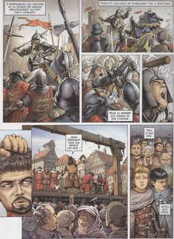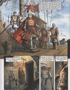 remarques: | titre complet: Isabelle, la louve de France Irlande 1315, Mortimer guerroie contre les irlandais soutenus par les écossais, Mortimer doit faire retraite et se sent trahi par Edouard II qui festoie en sa cour et n'intervient pas au côté de Mortimer pour réconquérir son fief irlandais >> p. 6 Isabelle obligée de partager la couche du roi avec son mignon Hughes Despenser en France, sur proposition de Robert d'Artois, le conseil des pairs confirme l'exclusion des femmes de la succession au trône de France mais seul le royaume est concerné, pas les fiefs ou autres dépendances, sa tante Mahaut conserve donc l'Artois et c'est un nouvel échec pour Robert, tandis qu'Isabelle met au monde un second fils Jean tout en subissant toujours les humiliations de son époux >> p. 19 toutefois Isabelle trouve réconfort dans les bras du gentil Mortimer et pour l'amour d'Isabelle, Mortimer se ralliera finalement à la conjuration contre Edouard II, l'Angleterre s'embrase, Edouard II demande la paix et chasse les Despenser, mais c'est pour mieux s'emparer de ses adversaires par trahison, toutefois avec l'aide de l'évêque d'Orleton, Mortimer réussit à s'échapper de la Tour de Londres et à se réfugier en France où entretemps Charles IV est monté sur le trône peu après, la guerre éclate entre françois et anglois pour la Guyenne, le duc de Kent à la citadelle de la Réole qui défend Bordeaux doit capituler Edouard II envoie Isabelle à Paris pour négocier, elle y retrouve Mortimer et ne retournera en Angleterre qu'avec une armée équipée par son beau-père flamand Guillaume de Hainaut, Edouard II sera menacé tandis que Robert d'Artois fabrique de faux-papiers pour récupérer son fief >> p. 42/43 septembre 1326, Isabelle débarque en Angleterre avec les 700 mercenaires flamands de Guillaume de Hainaut, elle y est accueillie en libératrice les Despenser sont exécutés, le roi emprisonné au château de Berkeley où il abdique en faveur de son fils Edouard III, il sera assassiné peu après sur ordre de Mortimer >> p. 47 la mort d'Edouard II par là où il avait péché en France, à la mort de Charles IV, son cousin Philippe VI est sacré roi de France en 1328, Edouard III conteste toutefois cette nomination de par la lignée de sa mère et poussé par Robert d'Artois, il entre en guerre contre Philippe VI, ce sera le début de la guerre de Cent Ans quant à Isabelle, elle se retira dans un couvent après que Mortimer l'eut trahie (Mortimer allié avec Philippe VI ?) et eut été exécuté par Edouard III n.b. la fin du récit diffère toutefois de celle du roman dans lequel Mortimer resta fidèle à Isabelle qui protesta et pleura lors de l'arrestation de Mortimer par Edouard III > un deuxième volume qui finit plutôt abruptement la série alors que le roman continuait encore quelque temps, un scénario toujours assez moyen, mais meilleur que le premier tome avec un graphisme respectable |