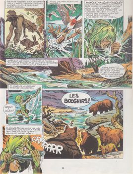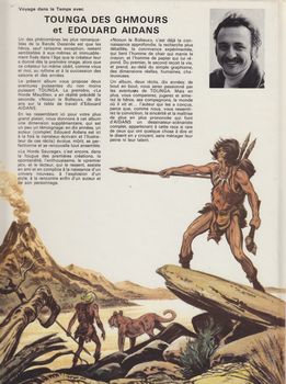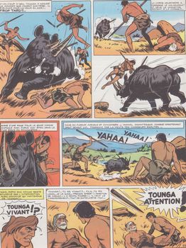 remarques: | aventures préhistoriques (sur référence à la guerre du feu de Rosny) avec Tounga, le chasseur musclé, son ami boiteux Nooun et Aramh le tigre géant des marais à longues dents, protecteur de Nooun album en deux épisodes: 1) présent: la horde maudite 2) passé: Nooun le boiteux avec la participation des mammouths, des rhinocéros noirs, des loups, des ours de caverne appelés Booghirs, des loups-hyènes, des vautours becs-crochus et autres habitants de ces temps un graphisme qui s'améliore au fil des albums, mais un scenario plutôt faible (normal pour des hommes de Néanderthal) Information Tounga est une bande dessinée réalisée par Édouard Aidans, parue dans Le Journal de Tintin dans les années 1960 et 1970, dans un cadre inspiré par le roman la guerre du feu, Tounga est un jeune et valeureux guerrier de la préhistoire qui utilise son courage pour sauver sa horde, les Ghmours et ses amis (le terme de tribu n'est pas utilisé), à l'instar de Rahan, il affronte des mammouths, découvre le propulseur chez une horde étrangère, croise des tribus exotiques, visite des îles étranges la différence est cependant sensible: Rahan est un philanthrope, Tounga est un guerrier, certes droit et généreux, mais capable de tuer pour se défendre |