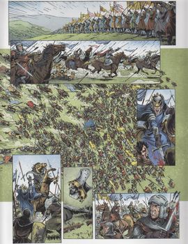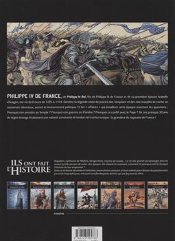 remarques: | dans la collection "ils ont fait l'histoire" 1315, exécution d'Enguerrand de Marigny avec lequel le règne de Philippe le Bel vient vraiment de se terminer >> p. 4 la pendaison d'Enguerrand au gibet de Montfaucon rétrospective en 1268: naissance de Philippe IV, petit-fils de Saint-Louis, la préparation de Philippe IV à la royauté >> p. 8/9 dissertation sur le métier de roi le droit = l'arme la plus subtile, la plus efficace et la plus féroce qui soit le roi = seigneur des seigneurs, le pape = seigneur des rois 1286 sacre de Philippe IV à 18 ans, son frère cadet: Charles de Valois, l'hommage d'un roi à un roi: celui d'Edouard Ier, roi d'Angleterre pour la Guyenne au roi de France Philippe IV, première dispute avec le pape Boniface VIII à cause de l'impôt direct sur les clercs (sans l'autorisation du pape) >> p. 15 Philippe IV et ses conseillers troubles en Guyenne où Philippe IV doit intervenir, puis il doit se battre en Flandre, alliée de l'Angleterre, réconciliation avec Boniface VIII pour obtenir de l'argent pour la guerre et défaite des flamands à Furnes en 1297, toutefois Philippe IV ne veut pas conquérir, il veut le pouvoir et l'obéissance de ses vassaux, il préfère recevoir l'impôt plutôt que de ruiner ses vassaux, Philippe IV marie pour raison politique sa fille Isabelle à Edouard II en Flandre, les Leliaerts (partisans du lys) s'opposent aux flamands de souche (les gueux), par la suite, Philippe IV n'aura de cesse de trouver de l'argent pour suivre sa politique et s'opposer à ses adversaires, il pousse son peuple à réfuter l'autorité du pape dans son royaume nouvelle dispute avec Boniface VIII et nouvelle révolte des flamands, 1302 défaite de la chevalerie à Courtrai (bataille des éperons d'or), mort du conseiller Pierre Flote et du sénéchal Robert d'Artois, ils seront remplacés par Guillaume de Nogaret et Charles de Valois Guillaume de Nogaret avec l'aide des Colonna réussira à humilier Boniface VIII qui meurt peu après, dès lors Philippe IV va garder la main mise sur la politique pontificale, notamment avec le pape français Clément V à Mons-en-Pévèle en 1304, Philippe IV écrase cette fois les flamands et rétablit son autorité en Flandre, en 1307, ce sera le procès des Templiers gagné par les juristes de Philippe IV ce qui anéantit la puissance et la richesse des Templiers (devenu un état dans l'état), Enguerrand de Marigny, nouveau conseiller du roi, rétablit les finances du royaume, car maintenant l'argent est le principal adversaire de Philippe IV, mais ce faisant, Marigny s'attire la haine du peuple et des seigneurs et pour terminer le règne de Philippe IV, il y aura encore l'affaire des brus du roi qui lui, meurt lors d'une chasse en 1314 n.b. en fin d'album, documentation sur la période de Philippe IV avec biographie >> un album plutôt intéressant avec un scénario solide et un bon graphisme au coloriage bien exécuté collection "ils ont fait l'histoire" >> voir Charlemagne 3 |