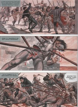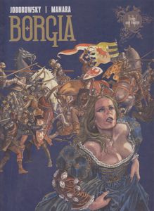remarques: | au château Pesaro, Lucrèce se heurte à son pseudo-époux et réussit même à le corriger ce qui oblige celui-ci à se réfugier dans le château de son oncle tandis que Charles VIII se lance à la poursuite de César Borgia en finissant son expédition à Naples >> p. 6/7 l'excursion sur le volcan Vésuve où Charles VIII trouve la mort dans une coulée de lave n.b. ce qui n'est pas historiquement juste, Charles VIII qui est de constitution fragile, mais pas nain et difforme, meurt au château d'Ambroise, il aura marié Anne de Bretagne et réuni ainsi la Bretagne à la couronne de France César sort de sa cachette et retourne à Rome avec le prince Machiavel, son ami et conseiller, qui lui prédit la conquête de l'Italie et peut'être même aussi de devenir pape à la place du pape son père entretemps, Giovanni ou Juan, frère aîné de César, se fait assassiner, le pape Rodrigo en est très affecté et prie pour son âme, mais quand il apprend que c'est César qui a fait assassiner son propre frère pour lui ravir le commandement de l'armée papale, Alexandra VI devient fou de douleur toutefois finalement, le père et le fils arriveront à se réconcilier, car le pape Borgia se rend vite compte que seul César comme chef militaire peut garantir le trône papal >> p. 12/13 deux belles planches de Manara de son côté, Lucrèce sur le point d'accoucher subit une césarienne et met au monde un petit monstre à deux têtes >> p. 22 au château Saint-Ange, César endosse son uniforme de chef de guerre et reçoit la visite de Leonardo da Vinci à qui il demande de nouvelles armes pour ses conquêtes, en compensation César offre son corps à Leonardo et devient son amant, la guerre commence alors avec des armes nouvelles tel que >> p. 29 les soldats volants et les chars suprêmes quant à Micheletto trois ans plus tard, il part retrouver sa mère en Calabre à qui il raconte la fin des Borgia: - César est atteint de la petite vérole et sombre lentement dans la folie tout en effectuant sa guerre de conquête durant laquelle il sort principalement vainqueur - le moine Savonarole est arrêté, torturé et exécuté >> p. 36 le supplice de Savonarole - un peu plus tard, le pape Borgia meurt empoisonné par le cardinal Della Rovere qui utilise lui-aussi une arme secrète >> p. 41 la jarre d'or aux deux compartiments qui permet d'empoisonner sans être empoisonné - Della Rovere devient pape sous le nom de Jules II, l'armée papale abandonne César qui doit s'enfuir en Navarre où trahi par le roi de Navarre, il meurt transpercé de coups de couteaux Micheletto réussit à s'échapper et ne voulant pas devenir mendiant, lui et sa mère se donnent la mort "vanitas, vanitatum et omnia vanitas" quant au destin de Lucrèce Borgia, Jodorowsky n'en parle plus (objet d'une prochaine série?) >> fin de la série Borgia par Jodorowsky, une série assez bien commencée, mais qui finit sans grande saveur avec un scénario peu recherché et parsemé des orgies borgiaques, seul le graphisme de Manara réussit encore à capter l'intérêt du lecteur annexes - couverture de l'album - une page de l'album - couverture de l'album intégral |