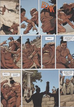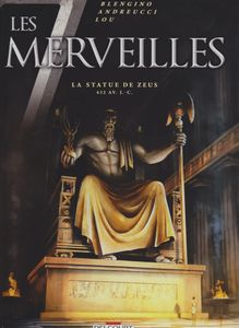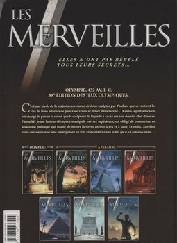 remarques: | début des jeux olympiques à Olympie alors appelé Ekecheira pour l'obtention d'une trève entre hellènes durant cinq jours où se déroulaient neuf compétitions avec un seul but: la nika = la victoire l'histoire d'Aurelios de Mykonos, l'athlète qui pleure devant la statue de Zeus, exécutée par Phidias, parce qu'il avait en son temps abandonné son fils >> p. 6 la statue de Zeus n.b. certains compétiteurs venaient à Olympie y mourir pour l'honneur, d'autres y arrivent aussi pour déjà corrompre les jeux >> p. 20/21 le combat de pancrace entre Aurelios et Alcimède de Sparte >> p. 17 l'amour d'Aurelios pour Gala alors que Kionis, champion d'Athènes, recherche un objet: le tétragramme qui aurait été caché par Phidias dans la statue de Zeus, un complot se prépare par les athéniens pour faire assassiner Phidias, mais pour ne pas les mettre en cause, le crime devait être exécuté par Pantarkès, champion d'Olympie, à la solde d'Athènes et amant de Phidias le tétragramme = message qui contient des secrets sur Periklès qui serait déchu si ses ennemis les rendent publique, finalement rien ne se déroulera comme prévu sauf que Aurelios découvrira son fils avant de mourir >> dernière page: documentaire (enfin!) sur la statue de Zeus (432 BC), sculpture constituée de chryséléphantine (alliage d'or et d'ivoire), la statue de Zeus dont il ne reste plus rien fut décrite par Strabon, elle mesurait 12 m de hauteur, Zeus tenait en sa main droite une statuette de Niké représentant la victoire et en main gauche un sceptre couronné d'un aigle = le symbole de divinité la statue fut transportée par la suite à Byzance et détruite lors d'un incendie en 461 AC Phidias avait aussi exécuté la statue d'Athéna Parthenos en 438 BC, mais en opposition avec Periklès, il dût partir en exil à Olympie, il parait qu'il avait une passion pour les messages cachés dans ses statues tel le message caché dans l'auriculaire de Zeus adressé à son bien-aimé le lutteur Pantarkès d'Olympie le principe de l'Ekecheira décrétant l'inviolabilité de la terre sacrée d'Olympie et de la sécurité des athlètes et des spectateurs >> un récit genre dramatique tissé autour de la statue de Zeus, un contenu plutôt faible tant pour le scénario que pour le graphisme qui est du genre plutôt sombre, bref l'album, lui, n'est pas une merveille premier album d'une série dont la suite n'est pas encore collectionnée ici les autres albums tous publiés en 2014 sont: 2/ les jardins de Babylone (585 BC) 3/ le phare d'Alexandrie (254 BC) 4/ le temple d'Artémis (356 BC) 5/ la pyramide de Kheops (2565 BC) 6/ le mausolée d'Halicarnasse (350 BC) 7/ le colosse de Rhodes (292 BC) n.b. le graphisme de chaque album est effectué par un dessinateur différent mais peu connu |