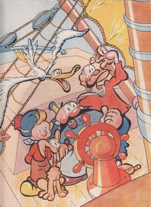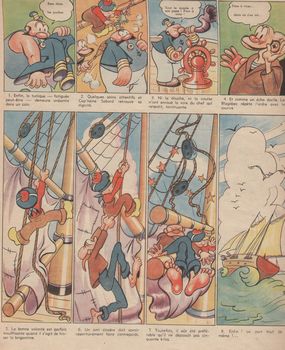 remarques: | premier album des aventures du Cap'taine Sabord, titre complet: un ami fidèle, album broché couleur de 16 pages, avec texte sous image comprenant aussi quelques phylactères le jeune garçon Artimon et son chien Cabestan veulent s'engager sur un bateau, mais partout on ne veut point d'eux, finalement, le Cap'taine Sabord sur le navire "la bonne humeur" accepte de prendre Artimon comme mousse toutefois, la présence de Cabestan n'est pas désirée, Cabestan réussira malgré tout à s'introduire sur le bateau comme passager clandestin, en route vers les îles Kalamatchaki, durant le voyage, Cabestan est découvert par le Cap'taine Sabord qui aussitôt le jette à l'eau, Cabestan s'en sortira-t-il? la suite dans le prochain volume >> des aventures loufoques et burlesques sans grande prétention, mais un assez bon graphisme et un coloriage bien réussi, Rigal se spécialisera aussi dans les films d'animation Information aventures parues dans les journeaux Pierrot (1938), Wrill (1946) et Cap'taine Sabord (1947-1949) qui contenaient aussi des bandes comme Gilles du maquis, Nestor le corsaire et Mizo et Friquet par Rigal il y eu plusieurs albums parus, mais seul cet album est collectionné ici à titre d'exemplaire représentatif de la série |