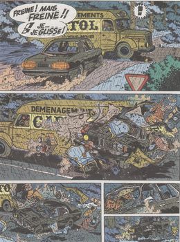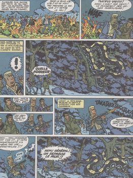 remarques: | c'est la suite de l'album "les yeux de feu" tandis que Valérine, poursuivie par de nombreux adversaires, cherche à avertir la police de la disparition de Ginger, celui-ci entretemps fait la connaissance avec le créateur de la base-laboratoire secrète du château qui veut établir une nouvelle humanité, il se présente comme étant le professeur Azinski, ex-proviseur de l'université de Léningrad qui a tourné le dos au régime communiste-totalitaire en quittant l'URSS avec son collègue, le prof. Sybacheff, spécialiste du cerveau et inventeur des hommes aux yeux de feu Valérine est toujours au prise avec ses poursuivants, mais parvient cette fois à les semer lors d'une collision >> p. 15 la collision spectaculaire d'une BMW avec un camion de déménagement (en quelque sorte, l'accident est aussi un déménagement) depuis sa base secrète, Azinski lance sur ses agresseurs des hommes aux yeux de feu dirigés par télépathie qui sont capables d'hypnotiser leurs ennemis ou de leur faire apparaître des visions cauchemardesques >> p. 21 la vision du serpent géant >> p. 25 à 28 l'histoire du prof. Azinski: dissident de l'URSS, Azinski avec son collègue Sybacheff mettent au point dans la solitude d'un château un système capable de révolutionner le cerveau humain en développant l'hypnose et la télépathie leur but: prendre le pouvoir et rendre le monde meilleur mais trahis par l'un de leurs hommes, Azinski et Sybacheff parviennent à s'échapper à bord d'un avion à décollage vertical tandis que Valérine et le commissaire Bouleau arrivent juste à temps pour arrêter les agresseurs et récupérer Ginger >> p. 45 la fuite bien imaginée du prof Azinski > toujours encore un genre polar mêlé à du scientifique, du mystérieux et de l'humour, du déjà vu, mais qui reste toujours encore amusant, tant pour le texte que pour le graphisme n.b. le numéro 2 mentionné ici fait partie d'une réédition par Dupuis dans la même année que la première édition (tome 5 en 1984) |