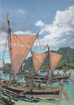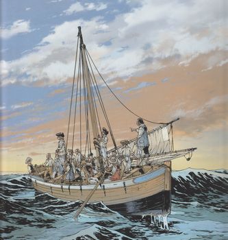 remarques: | dans la série Black Crow raconte 3/ la Bounty, la mutinerie des maudits (1789) février 1790, Black Crow arrive à l'île de Pitcairn où en 1789 le lieutenant Fletcher et ses hommes avaient décidé de s'échouer l'histoire du Bounty: août 1788, la Bounty fait escale en Nouvelle-Hollande (Australie) pour se ravitailler après 8 mois de navigation depuis l'Angleterre, le capitaine William Bligh a reçu la mission de ramener des plants d'arbre à pain depuis le Pacifique jusqu'aux Antilles afin de mieux pouvoir nourrir les esclaves noirs des Antilles, mais le capitaine est un homme dur et parfois inhumain avec son équipage qui complote contre lui, mais Bligh est aussi un homme fatigué; n.b. la presse = enrôlement de force comme marin l'ambiance à bord se détériore de plus en plus, seul le lieutenant Christian Fletcher garde encore l'estime de l'équipage, mais il commence lui-même à détester le capitaine Bligh >> p. 16/17 double-page, l'arrivée de la Bounty à Tahiti le 26.10.1788 le 5.4.1789 après 5 mois de plaisir à Tahiti, après la mort accidentelle de Huggan, le chirurgien de bord, par deux marins qui voulaient déserter et après la récolte des plants d'arbre à pain, >> p. 32/33 la Bounty appareille pour les Antilles comme le capitaine Bligh favorise plus les soins des plants que ceux de l'équipage, quelques matelots jettent des plants à la mer ou défèquent dans les jardinières, le capitaine veut faire un exemple et sévit en faisant flageller et mettre au fer les responsables, ce châtiment cruel déclanche la mutinerie le 28.4.1789, >> p. 42/43 Bligh et 18 de ses fidèles sont abandonnés sur une chaloupe le 29.6.1789 quelque part dans l'océan Pacifique; ils en réchapperont, mais leur équipée aura duré 47 jours quant à Fletcher et ses hommes, ils partiront à la recherche d'une terre isolée et s'échoueront avec quelques indigènes sur l'île de Pitcairn le 23.1.1790 après avoir brûlé leur navire la Bounty et lors de son arrivée à Pitcairn, Black Crow ne découvrira plus rien, les derniers survivants s'étant soigneusement dissimulés dans l'île par crainte d'être ramenés en Angleterre pour y être pendus comme mutins une expédition menée plus tard par le capitaine Bligh pour retrouver les mutins n'aura pas plus de succès >> l'histoire de la Bounty est archi-connue et bien sûr le récit de Delitte n'apporte rien de très nouveau, mais le graphisme reste excellent annexes - couverture de l'album - l'arrivée à Tahiti - la chaloupe de Bligh |