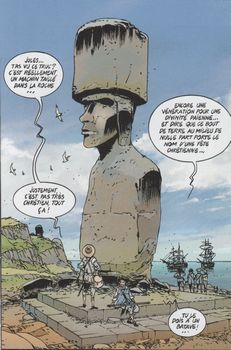 remarques: | dans la série "Black Crow raconte": la Boussole et l'Astrolabe, l'expédition de La Pérouse Jean-François de Galaup, comte de La Pérouse, né en 1741, disparu en 1788, participe d'abord à diverses campagnes militaires en Amérique avec la frégate Astrée, puis il est nommé par Castries, ministre de la marine et par Louis XVI pour commander en 1783 une expédition autour du monde visant à compléter les découvertes de James Cook dans l'Océan Pacifique, il quitte Brest avec deux vaisseaux: la Boussole et l'Astrolabe emmenant avec lui plusieurs hommes de science le 21.1.1793 la guillotine (décollation mécanique) fait des ravages dont la tête de Louis Capet = Louis XVI avril 1786, la Pérouse arrive à l'île de Pâques >> p. 7 les statues de l'île de Pâques découvertes le dimanche de Pâques 1722 par le hollandais Roggeveen >> p. 11 l'histoire de Pondichéry 1673-1765 en 1792 à Pondichéry, on est toujours sans nouvelle de l'expédition de La Pérouse qui aurait exploré, d'après les dernières nouvelles reçues, l'Alaska en juin 1786, entretemps les anglais occupent pratiquement sans résistance la colonie française de Pondichéry décembre 1787, La Pérouse aborde les îles du Navigateur (= Samoa) et tout comme avec Bougainville, les hommes de La Pérouse sont agressés par les Samoans mars 1789, La Pérouse fait escale à la Nouvelle Hollande (Sydney Australie) qui vient d'être occupée par les anglais; après s'être ravitaillé, l'expédition de La Pérouse se dirige vers les îles Vanikoro (Salomon) où les deux vaisseaux disparaissent (probablement suite à une tempête) on n'en entendra plus parler jusqu'en 1827 quand le capitaine Peter Dillon découvre les restes de l'Astrobale et ce ne sera qu'en 1962 que l'on retrouvera les restes de la Boussole, mais aucun journal de bord ni de survivants (ou leurs descendants) ne pourront être retrouvés >> p. 40 apparition de Black Crow >> surtout intéressant de par le graphisme (de magnifiques illustrations des voiliers de l'époque) et toujours une jolie couverture d'album annexes - couverture de l'album - carte de circumnavigation de l'Astrobale - peinture sur le naufrage de l'Astrobale - une statue de l'île de Pâques Information - la Boussole (précédemment le Portefaix) et l'Astrolabe (précédemment l'Autruche) sont les deux navires de l'expédition autour du monde entreprise par Jean-François de La Pérouse en 1785, à l'initiative du roi Louis XVI, ce sont des navires de charge, des gabares, reclassées en frégates pour les besoins de l'expédition le roi Louis XVI est très intéressé par les voyages entrepris par les britanniques, il confie alors au comte de La Pérouse la direction d'un voyage de circumnavigation, les méthodes de Cook pour éradiquer le scorbut sont appliquées avec succès, mais Robert de Lamanon et douze autres membres de l'expédition sont massacrés sur l’île de Maouna à Tutuila alors qu'ils cherchaient de l'eau à terre, les deux navires disparaissent dans les îles Salomon - les épaves retrouvées au large de Vanikoro (îles Salomon) en 1827 par le capitaine Dillon, puis en 1964, ont été formellement identifiées en mai 2005 comme étant la Boussole et l'Astrolabe1, un sextant retrouvé dans l'une des épaves porte l'inscription "Mercier" sur une plaque en laiton; or, la liste d'inventaire de la Boussole indiquait la présence d'un sextant confié par l'Académie royale de marine et fabriqué par le sieur Mercier, des traces de campement ont été découvertes sur la côte sud-ouest de Banie, l'île principale de Vanikoro, quant à la tradition orale autochtone, elle a conservé la mémoire de ce naufrage ainsi que du séjour des marins français sur l'île |