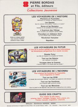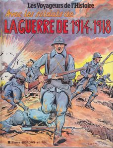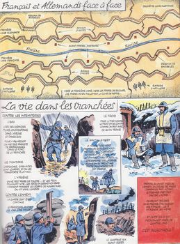 remarques: | été 1914, un été chaud, le jeu des alliances, Poincaré en Russie, Jean Jaurès qui oeuvre pour la paix est assassiné le 31.7., malgré tout en France c'est l'Union sacrée, l'Italie reste tout d'abord neutre à la bataille de la Marne, Joffre repousse les troupes de Moltke, c'est le début de la guerre des tranchées, sur le front de l'est, victoire de Hindenburg au Tannenberg, la Serbie est écrasée >> p. 11/12 la vie dans les tranchées entretemps se succèdent offensives et contre-offensives, des milliers de morts pour quelques centaines de mètres de terrain, c'est la guerre d'usure 21.2.1916 début de la bataille la plus sanglante: Verdun Pétain organise la défense en établissant la Voie sacrée, offensive alliée de diversion sur la Somme >> p. 15/16 les armes nouvelles: mitrailleuses, chars, gaz, l'aviation (Spad contre Fokker), sous-marins en 1917, début de la guerre de rupture, le 2.4. les USA entrent en guerre, révolution russe de mars 1917, le front est s'écroule, avril 1917 offensive française au Chemin des Dames sans grand résultat, octobre 1917 paix de Brest-Litovsk et arrivée du premier contingent américain, émeutes dans l'armée française, Pétain devient commandant en chef, à l'arrière c'est le rationnement fin 1917, Clémenceau à 77 ans est nommé premier ministre l'aide américaine devient considérable, surtout pour l'armement >> p. 19 la Madelon est remplacée par la chanson de Craonne le 21.3.1918 dernière grande offensive allemande ,mais les alliés résistent, Foch est nommé commandant en chef fin juillet, contre-offensive des alliés, fin août la poussée alliée est irrésistible 1.10.1918 l'Autriche d'abord puis l'Allemagne demande l'armistice, le 9.11. début de la révolution allemande 28.6.1919 traité de Versailles, 1920 création de la tombe du soldat inconnu >> p. 30 la Nouvelle Europe, formation de la SDN et chronique de la guerre >> bon résumé de la première guerre mondiale, mais graphisme peu élaboré, toutefois bien présenté annexes - couverture 1er plat - page de garde - extrait de page (les tranchées) - couverture 4ème plat Information " les voyageurs de l'histoire", une série assez richement fournie par Bordas dont - les grecs, les gaulois, Charlemagne, Henri IV - François Ier, Richelieu, Louis XIV - 14 juillet 1789, - la révolution française - Napoléon - avec les soldats de la guerre 14-18 et dans cette série, il y aura aussi: les voyageurs du futur et les voyageurs de l'inconnu |