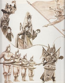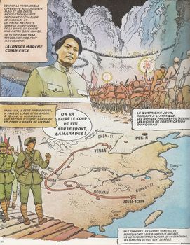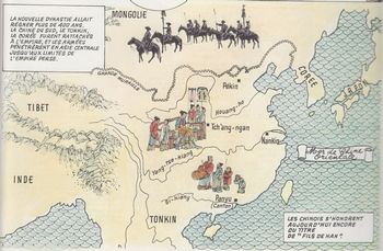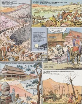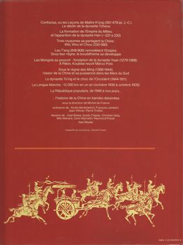 remarques: | l'histoire de Chine de Confucius à nos jours rédigée par André Bérélowitch en 9 épisodes, chaque épisode illustré par un dessinateur de bande dessinée différent: Bielsa, Crepax, Gaty, Manara, Marcello et Poïvet 1/ les leçons de maître K'Ong by Poïvet Chine orientale, 480 B.C., les leçons de maître K'Ong = Confucius Siao-Li enlève la jeune fiancée Chou-Kiang entretemps les principautés chinoises se font la guerre et Siao-Li est battu en 479 mort de Confucius, son disciple Tchouang-Tseu continue son oeuvre documentation (au temps de Confucius) 2500 B.C. début de la civilisation chinoise, l'écriture chinoise se développe dès 1800 BC, Confucius devient le symbole de la sagesse, de la modestie, de la vertu et du conformisme 2/ les bâtisseurs d'Empire by Bielsa (Ts'in Che Houang-Ti et Lieou Pang) Ts'in a fait bâtir la grande muraille et son nom a donné le nom de la "Chine" de 230 à 221 BC Ts'in écrasera les six royaumes de Chine et unifiera son empire, mais à sa mort, les seigneurs se révoltent, Lieou Pang devient le chef d'une bande de rebelles et prend le pouvoir, il devient roi de Han mais Siang-Yu, un géant sanguinaire, lui conteste le pouvoir¨ Lieou Pang sort vainqueur des combats et est couronné empereur de Chine en 202 BC il aura affaire aux incursions des Huns, il meurt en 195 BC, son fils Siao Houei lui succède et fonde la dynastie des Han qui allait règner sur la Chine, la Corée, le Tonkin et le Tibet durant 400 ans documentation A/ la route de la soie de Tch'ang-Ngan, capitale de l'empire (près de Nankin) à Palmyre, = 11'000 km, le voyage durait près de deux ans) >> p. 35 la fabrication de la soie B/ la grande muraille de Gansu (province du nord-ouest) jusqu'au sud de la Mandchourie, longue de 8852 km dont 6 259,6 km de murs, 359,7 km de tranchées et 2 232,5 km de barrières naturelles, telles des montagnes ou des rivière la muraille a une largeur moyenne de 7 m avec maximum 10 m par endroits et la hauteur moyenne est de 9 m avec un maximum de 15 m il a fallu au moins quatre dynasties d'empereurs pour parachever sa construction à cette époque, quatre empires se partageaient le monde: Rome, la Chine des Han, les Parthes et les Kouchans (au nord de l'Inde) 3/ les trois royaumes by Bielsa en 170 A.C. la dynastie Han doit faire façe à des nouveaux rebelles (les turbans jaunes), des luttes internes pour le pouvoir se déclanchent, guerre du nord contre le sud, aucun parti ne peut prendre l'avantage et ce sera la fin de l'unité chinoise et de l'empire des Han, la Chine se divise alors en trois royaumes: - le royaume de Chou (au sud-ouest) - le royaume de Wou (au sud-est) - le royaume de Wei (au nord) mais ces royaumes connaissent maintenant une période de troubles documentation (dans la Chine morcelée) période de poètes tel que T'ao-Ts'ien (365-427) et Jouan-Tsi (210-263), le philosophe Si-K'ang confucéens, taoïstes et bouddhistes ne croient pas en un dieu unique, mais leur univers est peuplé de démons s'opposant aux sages (la légende du roi des singes) 4/ un pélérinage sous les T'ang by Poïvet l'histoire de Sakyamuni Gantama qui prendra le nom de Bouddha (= l'éveillé) et qui a trouvé la délivrance spirituelle (nirvana) à sa mort en 487 il avait dénoncé les trois racines du mal: la convoitise, la haine et l'ignorance la légende du roi des singes et du moine Hiuan-Tsang, maître de la loi aidé par la déesse Kouan-Yin documentation une civilisation raffinée: les T'ang en 589, c'est l'âge d'or de la Chine avec sa capitale Tch'ang-Ng'an, développement des arts, du commerce de la porcelaine, de l'astronomie, de la xylographie ainsi que de la mode du thé n.b. xylographie = impression, estampe obtenus à l'aide d'une planche de bois de fils gravés par la méthode de la taille d'épargne (technique de gravure) n.b. la légende du roi des Singes raconte comment il a aidé à protéger Xuan Zang, un moine, lors de leur voyage en Inde afin de rapporter des livres sacrés bouddhistes en Chine, pour protéger Xuan Zang, au cours de leur voyage de 10 ans, il combat 81 créatures légendaires, les vainquant une par une… en utilisant ses incroyables compétences en Kung Fu 5/ les Mongols en Chine by Crepax en 1260 à la mort de Gengis Khan, son fils Koubilaï se fait proclamer grand khan et en 1276 les mongols investissent la Chine, l'empire chinois des Song est renversé, l'empereur et sa famille sont déportés en Mandchourie, mais Kao-Tsong, fils de l'empereur, réussit à s'échapper et continue la lutte contre les envahisseurs depuis la Chine du sud; en 1277, les mongols s'emparent de Hang-Tcheou puis de Canton, Kao-Tsong meurt en prenant la fuite avec sa flotte Koubilaï Khan devient empereur de Chine et fonde la dynastie Yuan, il s'installe à Pékin, il projette de conquérir le Japon avec une puissante armada, mais une tempête (nommée par les japonais kamikaze = vent des dieux) détruit complètement la flotte mongole, Koubilaï khan échouera aussi dans la conquête de l'Annam et de la Cochinchine Koubilaï respecte toutefois toutes les religions, le christianisme commence à pénétrer en Chine ainsi que les lamas tibétains et les marchands musulmans en 1294, Koubilaï meurt, aussitôt les chinois se révoltent, animés par des sociétés secrètes tel que les frères du lotus blanc, Temur khan succède à Koubilaï, mais en 1368 les mongols sont chassés de Chine Tchou-Yuan-Tchang devient empereur et fonde la dynastie des Ming documentation (les Song et les Yuan) développement des peintures de paysage >> p. 86/87 une fresque chinoise dès le XIème siècle l'imprimerie est inventée, développement de la navigation et du machinisme c'est sous l'époque Song que sont connues l'imprimerie, la poudre et la boussole la dynastie mongole des Yuan leur succède, puis celle chinoise des Ming 6/ sous le règne des Ming by Gaty avec Yong-Le, le règne des Ming atteint son apogée, la Mandchourie est conquise, s