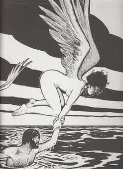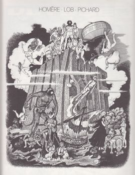 remarques: | épisodes parus dans les périodiques Linus, Charlie Mensuel, Phénix et France-soir - les vainqueurs de Troie rembarquent pour leur patrie lointaine dont Ulysse qui tarde à retrouver sa chère Pénélope et Homère qui écrira durant le voyage l'Iliade et l'Odyssée, mais Ulysse doit encore affronter le courroux de Poseidon (qui avait soutenu les troyens) malgré le soutien d'Athéna qui intervient pour Ulysse auprès de Zeus - d'abord une terrible tempête pousse le navire d'Ulysse vers Polyphème, le gardien-robot du monde interdit, réservé aux dieux >> p. 11-14 la lutte contre Polyphème, le cyclope à un oeil - Ulysse réussira à aveugler Polyphème mais celui-ci dans un dernier sursaut rendra Homère aveugle puis ce sera la rencontre avec Eole, le maître des vents qui capture Ulysse et ses compagnons, après les avoir donné comme jouet pour ses filles, Eole rejette le navire sur les flots en utilisant un réacteur - enfin Ulysse arrive sur une île inconnue où plusieurs de ses amis envoyés en reconnaissance sont changés en cochons, Ulysse tombera sous le charme de la sorcière Circé, tombée amoureuse d'Ulysse qui subira le mal de Circé, il réussira à regagner son navire où son équipage sera obligé de l'attacher au grand mât pour échapper à >> p. 63 la tentation et l'histoire des sirènes, captives des tritons - sur son parcours, Ulysse arrive au royaume des morts où règne Hadès, son épouse Perséphone et les femmes-vampires, les furies >> p. 73 la machine à voyager dans les puits Hadès permettra à Ulysse et ses amis de quitter son domaine pour continuer son voyage mais Ulysse devra encore traverser le détroit de Charybde en Scylla >> p. 86/87 le passage et la ruse d'Ulysse pour échapper à Scylla - enfin dernière Île, celle d'Helios, le dieu du soleil avec ses filles et ses vaches qui donnent le lait = philtre de jouvence pour les dieux les compagnons d'Ulysse ayant sans le savoir tué de nombreuses vaches, Zeus leur envoie la foudre du ciel pour les punir - le navire sombre mais Ulysse est sauvé par Calypso, la déesse de l'amour et du bout du monde avec son serviteur-androïde Andros, Calypso retiendra Ulysse mais sur l'intervention de Zeus devra permettre à Ulysse de continuer son voyage afin de rejoindre Ithaque Ulysse devra encore reconquérir son trône et se débarrasser des prétendants de Pénélope mais à la fin de son périple, Ulysse ne profitera pas de repos avec Pénélope et partira pour de nouvelles aventures >> un récit technico-aphrodyssiaque à la sauce Lob et au graphisme particulier de Pichard qui ne se montre pas ici encore trop osé dans ses dessins avec toutefois une tendance déjà bien marquée (voir les pages de garde à la fin de l'album) |
