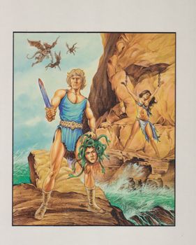 remarques: | - l'oracle avertit le roi Acrisios que sa fille Danae aura un fils qui tuera le roi, Acrisios fait alors enfermer Danae dans une tour d'airain sans fenêtres, mais Danae est fécondée par Zeus et met au monde un fils: Persée >> p. 7 la fécondation de Danae par Zeus Acrisios n'ose pas les tuer mais les abandonne dans la mer à leur sort sur ordre de Zeus, ils sont sauvés par Poseidon et recueillis sur l'île de Scripos par un pêcheur, devenu adulte, Persée est chargé par le roi Polydecte d'une mission quasiment impossible: tuer Méduse, une des soeurs Gorgone par cette mission et en l'absence de Persée, Polydecte espère prendre Danae comme amante et esclave >> p. 14/15 le supplice de Danae - guidé par Minerve/Athéna, Persée trouve le chemin du domaine des Gorgone, Athéna lui donne aussi les sandales de Mercure, l'épée d'Hermès et son propre bouclier magique - grâce au bouclier d'Athéna qui réfléchit tel un miroir le regard de Méduse, Persée réussit à trancher la tête de Méduse >> p. 29 la lutte contre Méduse - sur le chemin du retour, Persée délivre la princesse Andromède de l'emprise du monstre marin en utilisant la tête et le regard de Méduse >> p. 34-37 le combat contre le monstre marin - puis Persée s'introduit dans le palais de Polydecte, délivre sa mère et exécute Polydecte et sa garde à nouveau avec le regard de Méduse >> p. 49 le regard pétrifiant de Méduse - continuant son périple, Persée participe aux jeux olympiques sur une île voisine et lors du tir au javelot, son javelot tue par accident le roi Acrisios qui participait aux jeux comme spectateur, ainsi fut accomplie la prophétie >> un récit retraçant l'épopée de Persée mais surtout un graphisme bien exécuté par Musquera qui est le dessinateur de plusieurs oeuvres historiques tel que l'histoire de France, les grandes batailles de l'histoire ainsi que le vicomte, les envahisseurs, Omega, Melly Brown, Lucius, Peggy Press et Monsieur Wens |