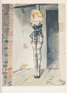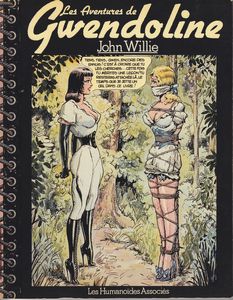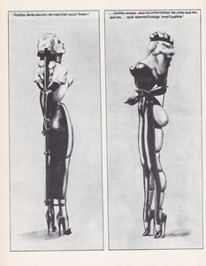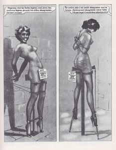 remarques: | titre complet: les aventures de Gwendoline par John Willie alias John Alexander Scott Coutts, dessinateur britannique 1/ préface par Dionnet Dionnet se montre un peu plus réaliste dans l'introduction de cet album concernant Gwendoline que Bourgeois dans l'introduction des oeuvres de Pichard, mention de deux figures érotiques: Linda Lovelace (exercices de fellation) et Gilda (gants noirs) 2/ préambule par Allen Jones - définition des catégories de l'imagerie populaire (qui doivent présenter au moins quelque mérite esthétique): - le dessin satirique, social et politique - les illustrations de livres - la bande dessinée proprement dite (comic strips) - le dessin publicitaire - le dessin animé et les pin-ups - les dessins érotiques doivent faire abstraction de toute pornographie, les formes des héroïnes de Willie sont surtout anatomiques (étude objective des corps humains), - Willie est le maître du bondage et passionné par les jeunes filles en détresse (genre little Annie Fanny) 3/ commentaires par J.B. Rund - biographie de John Willie, alias John Coutts, né en 1902 et mort en 1962 - son graphisme représente un monde réel plutôt qu'imaginaire, mais c'est une réalité dans un contexte imaginaire avec dessin au trait, à l'encre et au lavis ainsi que des aquarelles - Willie publia la plupart de ses oeuvres dans sa propre revue "bizarre" dès 1946, il produisait alors des bandes d'humour et ringardes sur fond sadiste avec une attirance particulière pour le bondage et la flagellation mais sans jamais montrer de sang - il se dessina lui-même sous les traits du personnage de "Sir Dystic d'Arcy" 4/ lettre de John Willie sur le bondage (1952) - Willie dénonce particulièrement les gens du clergé comme des pervers sexuels - explication sur les méthodes de bondage a) le bondage par enroulement de la corde (nuque, aisselles, dos, cuisse, poignet) b) le bondage diabolique: dans la position du Bouddha et sur une chaise nota bene: - le bondage pratiqué déjà par Houdini pour ses tours de magie - une autre forme de bondage peut se pratiquer avec des corsets - le bondage en soi est un amusement sexuel qui donne un certain plaisir érotique sans toutefois mettre en danger la vie de la (ou du) complice 5/ le récit (** les meilleurs épisodes) A) dessin au trait (pages 17 à 84) ** aa) épisode 1, Gwendoline et la course pour la coupe - l'enlèvement de Gwendoline, délivrée par l'agent secret féminin U89 et re-capturée par d'Arcy et sa complice, la comtesse noire >> p. 24/25 un bondage parfait >> p. 28 des agresseurs avec l'accent allemand (des nazis?) >> p. 54 la cage-prison >> p. 58 le déguisement en paysanne d'Abyssinie >> p. 62 la vie est belle (d'Arcy dixit), personnellement je la trouve ennuyeuse répond la comtesse noire >> p. 69 on se préoccupe plus des chevaux que des humains bb) épisode 2, la cueillette aux mûres * épisode de bondage sur la petite orpheline Sally cc) épisode 3, Gwendoline, la reine de l'évasion * >> p. 84 l'auto-flagellation B) dessin à l'encre de Chine et au lavis (p. 85 à 128) * - Gwendoline et la princesse disparue >> p. 99 un corset à découvert >> p. 112 la technique du baillon >> p. 120 la princesse tourmentée C) aquarelles )p. 129 à 145) ** >> p. 133 l'attelage des femmes >>> avec John Willie, Gwendoline devient l'icône du bondage, il y aura d'ailleurs plusieurs albums (la plupart en anglais) par Willie dont le retour de Gwendoline - un album sado-masochiste avec une tendance particulière au bondage - en partie un bon graphisme mais un scénario plutôt naïf avec quelques belles planches érotiques en p. 24/25, 50, 121, 134, 139, 143 Annexes - Gwendoline, couverture de l'album - Gwendoline, page 143 (une pauvre princesse) - Gwendoline, page 108 (bondage à corset) - Gwendoline, page 121 (poses pas très confortables) |