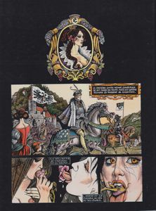 remarques: | titre complet: la comtesse rouge Nadasdy, Erzsebet Bathory d'après Leopold von Sacher-Masoch, die Blutgräfin, auteur aussi de la Venus à la fourrure 1/ préface by J.-M. Lo Duca - la comtesse sanglante de Transylvanie qui entretenait par du sang humain la jeunesse de son corps - histoire de sang, de sexe et de mort 2/ Vienne 1611, on discute beaucoup sur les bains de sang de la comtesse Nadasdy, le chevalier Emmerich devient amoureux de la comtesse et se fait inviter dans son château où ses victimes sont suppliciées >> p. 14 la comtesse rouge-sang >> p. 32 supplice pour mâle et femelle - par amour pour la comtesse, Emmerich deviendra son amant et sa victime en lui laissant prendre son sang >> p. 47 le supplice d'Emmerich mais les agissements de la comtesse et de son (ou de sa complice), l'éphèbe Ipolkar, seront finalement démasqués, ses complices brûlés et la comtesse emmurée vivante (= la mort vivant), elle mettra trois ans à mourir >> p. 49 la comtesse mise à la question >> adaptation pichardienne basée sur la légende (mais probablement en partie véridique) de la comtesse rouge (la femme-vampire) le graphisme de Pichard est toujours encore de bonne fracture sans pour autant atteindre les splendeurs d'antan annexes - 1er et 4ème plat de l'album - page extraite de l'album Information Élisabeth Báthory de Ecséd (Báthory Erzsébet est une comtesse hongroise (1560-1614) les accusations d'un pasteur luthérien, et de nombreux témoignages à charge, font d'elle l'une des plus célèbres meurtrières de l’histoire hongroise et slovaque le cas de Báthory a inspiré de nombreuses histoires et légendes, selon lesquelles elle se serait baignée dans le sang de ses victimes pour garder sa jeunesse, ce qui lui vaudra, entre autres, les surnoms de "comtesse sanglante" ou "comtesse Dracula", si ces légendes sont largement mises en doute par les historiens modernes, elles persistent malgré tout dans les croyances populaires |
