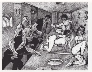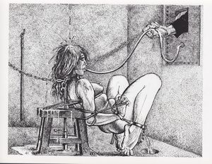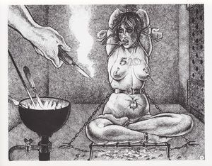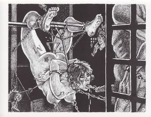 remarques: | titre complet: MCPM = maison de correction princesse Mélanie, maison de correction pour femmes de toutes classes, 64 pages, format italien - 1911, création d'une maison de correction pour femmes par le mari de la princesse Mélanie dans une petite principauté d'Europe Centrale, - prison à caractère de rééducation et de punition première pensionnaire et expérimentatrice: Leopolda, amie intime de la princesse - par la suite, d'autres femmes animeront la maison de correction dont de petites bourgeoises, des mères et filles de petite vertu, des femmes dévoyées de haute noblesse, tout ce monde pour le grand plaisir de la princesse Mélanie qui viendra admirer et jouir des supplices de ses victimes, mais le prince ayant été déchu, la princesse Mélanie sera envoyée, elle-même, en maison de correction et deviendra une pensionnaire attitrée, infortunée et suppliciée de sa propre maison de correction - album exécuté avec texte sur une page et image sur l'autre dont les plus imaginatives (mais où Pichard va-t-il chercher de pareilles idées?): - p. 4 le lavement interne - p. 9 le lavement externe - p. 13 la scarification (incision superficielle de la peau) - p. 16 la machine infernale - p. 17 la femme gavée de foie gras - p. 19 la marche punitive - p. 22 une pose fort lascive - p. 23 le supplice au fil de fer barbelé - p. 27 le supplice réciproque - p. 29 le supplice de la petite cage de fer - p. 33 le supplice de l'épinglement - p. 34 femme sur étal - p. 36 femme illuminée - p. 38 l'arrachage des dents - p. 40 la machine à jouir - p. 42 le supplice du pal - p. 43 le supplice de la goutte d'eau avec pose très érotique - p. 45 la chaufferie des dames - p. 55 la séance de photographie - p. 56 le supplice du phonographe (pour la rééducation) >> une réédition du monde des femmes tourmentées de Pichard, cette fois dans une maison de correction au lieu d'un couvent pour mortification (avec la langue perçée d'un anneau = une nouvelle spécialité de Pichard) - des femmes qui deviennent plutôt cauchemardesques et décharnées plutôt qu'attirantes et érotiques (à comparer avec Marie-Gabrielle de Saint-Eutrope) - la série a fait son chemin de croix et ne peut guère apporter de meilleur, toutefois quelque bon graphisme pour quelques planches érotiques annexes - couverture de l'album - p. 13 la scarification - p. 27 la tentation - p. 43 le lavement - p. 45 la chaufferie de ces dames |