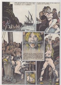 remarques: | album plein toile, couverture rouge, 102 pages 1/ préface de Michel Bourgeois qui tente de sensibiliser les récits érotiques de Pichard comme des oeuvres artistiques semblables à ceux de certains écrivains célèbres qui eux auraient eu l'intention, mais pas l'exécution d'écrire de tels récits - malgré tout, l'apologie de Bourgeois ne peut toutefois pas nier l'aspect sado-masochiste des illustrations de Pichard qui malheureusement persiste et signe dans ce deuxième album nettement en-dessous du premier en qualité a) les aventures érotiques de Pulchérie, la vagabonde, qui est condamnée pour le vol d'un pain à 20 ans de réclusion par la justice de l'époque b) la triste histoire des deux adolescentes, Malvina et Simplicie, enlevées par le bohémien Ercole Serpoletti et sa femme Desdemona qui font passer leurs victimes comme deux jeunes filles sauvages capturées aux Amériques et les présentent comme telles dans des représentations de ville en ville >> p. 15 le dressage de Malvina >> p. 16 le repas des deux pseudo filles-fauves par la suite, Simplicie cause la mort de Desdemona, elle sera jugée et exécutée sauvagement, alors que Malvina se retrouve placée dans un hospice de folles dirigé par le chevalier Arsène Glaireu, - elle y rencontrera Pulchérie, toutes deux y subiront les sévices d'Arsène Glaireu et de ses complices, Malrot Tartuffier et M. du Pensoir, deux maquereaux qui se livrent à la traite des blanches, en l'occurence de jeunes chrétiennes bien achalandées destinées aux barbaresques qui en sont très friands >> p. 23 Pulchérie est munie d'un corset de fer >> p. 24 une Pulchérie maltraitée, mais fraîche de chair et bien constituée >> p. 29 Glaireu traite mal ses patientes, mais c'est pour leur bien >> p. 30/31 la visite de l'hospice c) les chrétiennes en Orient - retrouvailles avec Marie-Gabrielle qui retourne, après la mort de son amant Octave de Poulnay, à sa première condition de condamnée, cette fois dans un bordel, puis elle est vendue par Tartuffier comme esclave dans le harem du sultan >> p. 43 la pose britannico-victorienne à la cour du sultan >> p. 46 l'arrivée au palais des 1001 tortures (planche pleine page) et livré aux caprices de Zomorobe, la favorite du sultan >> p. 48 le quatuor dans le harem sultanesque: Marie-Gabrielle, Malvina, Pulchérie et une nouvelle venue: Euphrosine Du Pensoir, fille du maquereau Du Pensoir, vendue comme esclave pour payer les dettes de son père >> p. 54 l'empalement enflammé >> p. 61 et c'est au tour de la favorite qui a perdu l'estime du sultan de subir les pires sévices >> p. 70 le supplice des rapaces pour Marie-Gabrielle d) le comte de Monte Cristo - Marie-Gabrielle est délivrée par le comte de Monte Cristo (un curieux métèque selon Marie-Gabrielle) et par son serviteur Ali qui refuse toutefois de se souiller au contact d'une chrétienne et même son cheval refuserait de porter Pulchérie >> p. 75 le marché aux esclaves-chrétiennes condamnées aux galères - Marie-Gabrielle se laisse expliquer la philosophie du comte de Monte Cristo selon les principes de M. de Saint-Simon pour rééduquer les femmes condamnées et Marie-Gabrielle qui se sent offensée par ces méthodes est également rééduquée par le comte >> p. 83 l'histoire de l'infortunée Ermeline capturée par de sauvages pirates arabesques et cette fois, ce sera Haydée, la compagne de Monte Cristo qui devient la tortionnaire des femmes ramenées par Monte Cristo >> p. 85 une autre machine infernale >> p. 91/92 la maîtresse d'un riche banquier dont les intimités doivent aussi profiter aux petites gens au lieu de les réserver à un seul nanti - finalement, usant de son charme et de sa docilité apparente, Marie-Gabrielle réussira à prendre en otage le comte de Monte Cristo, elle l'oblige à faire libérer toutes les condamnées, puis Marie-Gabrielle et ses compagnes prennent le large avec le yacht à vapeur du comte >> un récit cette fois plutôt sadico-humoristico sans grand intérêt pour le récit et en nette dégression par rapport au graphisme du précédent album (des pichardettes plutôt décharnées), - les illustrations sont répétitives et du genre plutôt pornographique malgré quelques planches bien érotiques Annexes - couverture de l'album >> p. 24 Marie-Gabrielle bien habillée >> p. 91 la maitresse d'un riche banquier >> p. 83 les malheurs de mademoiselle Ermeline |