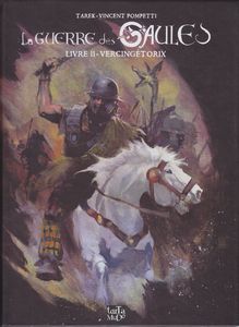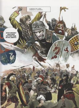 remarques: | livre II de la guerre des Gaules selon Caius Julius Caesar - en 55 BC, avec les cavaliers arvernes de Vercingétorix comme alliés, César combat les germains et les oblige à repasser le Rhin, César mène une campagne de 18 jours en Germanie où il est le premier à pénétrer - après coup, il effectue sa première expédition en Bretagne, mais doit se replier par manque de cavalerie et de ravitaillement suite à une tempête sur la Manche >> p. 14 l'artillerie et p. 20 la flotte romaine - en Gaule, le druide Gutuater appelle à la révolte générale, il est suivi par Ambiorix et ses Eburons qui massacrent les deux légions de Sabinus et de Cotta, mais en 53, César et Labiénus mettent un terme aux révoltes dans le nord de la Gaule - Eponine est devenue chez César l'espionne de Vercingétorix qui est d'accord de prendre les armes contre les romains et de trahir César, toutefois il estime que c'est encore trop tôt pour agir et attend le rassemblement définitif des grandes tribus celtiques (n.b. mais même réunis les gaulois ne seront pas capables de s'opposer aux légions romaines et curieusement les cavaliers germains surpassent maintenant les cavaliers arvernes) - Crassus mort, Pompée quitte l'alliance avec César à la mort de son épouse Julia, fille de César et la Gaule est à nouveau en ébullition, César se retrouve en position inconfortable, menacé à l'extérieur par les gaulois et à l'intérieur pas ses ennemis au sénat - en 52 BC, soulèvement de Cénabum, mais les gaulois échouent à isoler César de ses légions du nord et pour pallier à la défection des cavaliers arvernes, César engage des cavaliers germains >> p. 43 le siège d'Avaricum - puis César met le siège devant Gergovie qu'il n'arrive toutefois pas à enlever et doit se retirer, première victoire de Vercingétorix, mais au nord Labiénus défait les troupes de Camulogène - Vercingétorix veut en finir avec l'armée de César et engage la bataille dans la plaine, toutefois les germains font la différence et Vercingétorix doit se réfugier dans la place forte d'Alésia où il devra se rendre à César malgré l'intervention d'une importante armée de secours gauloise (automne 52 BC) - César devient le maître incontesté de la région la plus riche et la plus peuplée d'Europe >> 2ème album adapté de la guerre des gaules par César, agrémenté de quelques variantes mais restant fidèle au texte de César, un 2ème album dans la cuvée du 1er, texte sans surprise et toujours un graphisme original en forme d'aquarelles et pas de suite avec un volume III |