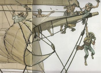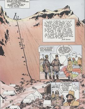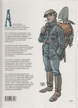 remarques: | album en deux épisodes, dédicacé par André Juillard 1/ Coeur-de-Gris 1667 critère:* Coeur-de-Gris, le pirate chasseur d'or à bord du lougre "frelon" avec un petit équipage prend la mer depuis l'île de la Tortue pour Cuba via la côte nord de Saint-Domingue, il y rejoint les boucaniers de l'île de Cuba, mais tous sont surpris par une troupe d'espagnols de réputation féroce: les lanceros les boucaniers perdent du terrain, mais Coeur-de-Gris et ses flibustiers réussissent à prendre les espagnols à revers et à les repousser avec l'appui des boucaniers, Coeur-de-Gris peut maintenant mettre son plan en action: s'emparer des navires de la flotte d'argent qui ont été isolés par les tempêtes et par ruse, Coeur-de-Gris s'approche d'un galion fortement armé en se faisant passer pour un pêcheur inoffensif >> p. 16/17 le galion "santa Trinidad" dans toute sa splendeur, un vrai château sur mer, mais dont l'équipage avait été très éprouvé par une tempête et le galion sera pris d'abordage et capturé par les frères de la côte avec un riche butin >> p. 22 retour à l'île de la Tortue en déployant le fameux pavillon noir 2/ Jack London 1897 critère:** les aventures romanesques de Jack London qui à 22 ans se lance à la prospection/chasse de l'or à Dawson City au Yukon sur la rivière Klondike en passant par Juneau/Alaska >> p. 30/31 le dur transport de l'équipement à dos d'homme sur des chemins périlleux >> p. 32 la traversée de la Chilkoot pass, une pente à 45° puis il faut construire soi-même un bateau pour continuer sur le fleuve Yukon en direction de Dawson City (env. 1000 km), hivernage à Henderson Creek au confluent de la Stewart river >> p. 38 visite de Dawson City (150 km de Henderson), une ville de fous et de débauche à défaut de trouver de l'or, Jack London fait du commerce de bois et fera finalement fortune en écrivant des romans dans lesquels sont racontées ses équipées dans le grand nord (le grand silence blanc, la fille des neiges, croc-blanc, l'appel de la forêt et autres histoires de l'Eldorado du nord, pays de l'or) >>> à deux siècles d'intervalle, deux chasseurs d'or risquent leur vie pour le même rêve, le premier épisode est du genre pirate, plutôt banal, mais le deuxième est des plus intéressant avec comme toujours un excellent graphisme de Juillard |