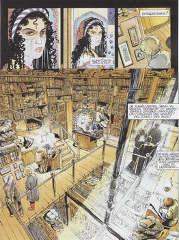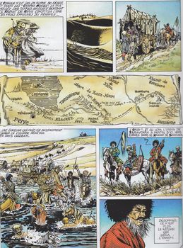 remarques: | l'offensive des cosaques se poursuit vers Samarcande, une cité merveilleusement riche avec KöK Saray, le palais bleu, mais le voyage n'est pas de tout repos, il faut compter avec les pièges de la nature dont surtout le désert de Kara-Koum >> p. 11 la carte de l'itinéraire >> p. 16-18 la grande bataille contre les perses ouzbeks >> p. 21 le duel interrompu entre Roslav et Tchinguiz la vraie raison du raid sur Samarcande: s'emparer d'un livre illustre: le miroir d'Allah (un atlas très précis avec une cartographie inégalée sur les voies de communication entre l'Asie et l'Europe), ceci pour le compte de la Compagnie Hollandaise des Indes >> p. 39 la bibliothèque au pavillon de la sagesse, mais le vrai livre se trouve dans l'ancien palais Zafer et Roslav n'a maintenant plus que deux jours pour s'en emparer (la suite dans le tome 3) >> scénario toujours intéressant avec l'excellent graphisme de Savey - quelque similitude avec la quête du livre "la marque du prophète" de la série décalogue (Giroud doit bien aimer les livres) |