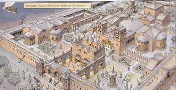remarques: | suite à la mort de Chaillet en septembre 2011, le graphisme a été repris par Dominique Rousseau alors que le scénario avait déjà été conçu par Chaillet vers 400 AC, Alaric s'apprête à envahir Rome tandis que Ragadaise (= Radogast) fait brûler Vindobona (= Vienne) et qu'en Italie, Flavien est devenu préfet de Rome et l'homme de la réconciliation, mais il a fort à faire pour persuader ses anciens amis à ne plus retourner à leurs anciens dieux >> p. 8 l'attaque des loups pris comme un avertissement du ciel, car jusqu'alors la louve symbolisait la protection de la cité >> p. 11 le palais impérial à Ravenne, entouré de marais infranchissables, où Honorius, Stilico et sa femme Séréna ont élu domicile Flavien recherche toujours encore les véritables meurtriers de sa femme et de son fils >> p. 13/14 le gros Victor Olympius, le maître des offices, est soupçonné par Flavien alors que le jeune Honorius a quelque difficultée avec sa mascotte, un coq surnommé Rome les intrigues de Séréna, l'ultra-catholique, rend à Stilico la tâche de réconciliation entre païens et chrétiens bien difficile >> p. 25 la collection de livres anciens de Symmaque contenant les prophéties des sibylles espérant que la dernière prophétie (la septième) sauverait le destin de Rome >> p. 26 la solution serait au temple de la fortune Primigenia à Préneste, Flavien y découvre les livres sibyllins, mais aussi ses persécuteurs entretemps Stilico bat Radagaise, le païen, et propose de s'allier avec Alaric mais il est assassiné par les conseillers d'Honorius, Stilico était considéré comme le dernier des romains et avec son assassinat disparaissait la dernière chance de sauver Rome, Séréna ayant voulu faire alliance avec Alaric est arrêtée et condamnée à mort par le sénat en 410 Rome est pillée par Alaric avant de mourir, Séréna rèvèle à Flavien que son fils est dans un monastère près de Rome, mais quand Flavien y arrive, c'est pour apprendre que son fils est parti pour Emèse Flavien retrouve Marie et avec elle retourne à Emèse où il rencontre enfin son fils Marcus devenu chrétien avec lui, il comprendra les mystères des sept prophéties qui sont assez semblables aux sept sceaux de l'Apocalypse >> la septième et dernière prophétie des livres sibyllins causera la chute de Rome >> le septième sceau de l'agneau dans l'apocalypse prédira la fin du monde >> p. 52 on ne doit pas s'amuser tous les jours avec ton sage (Flavien dixit à Marcus en parlant d'Augustin d'Hippone) facit: Rome est restée en quelque sorte éternelle et Emèse est devenue Homs en Syrie >> un dernier album qui veut faire durer la dernière prophétie et qui clôt définitivement la série, c'est la fin de l'empire romain et de la série prophétique si le scénario n'a plus grand chose à offrir, le graphisme reste acceptable malgré la reprise de Chaillet par Rousseau annexes - couverture de l'album - le palais impérial de Ravenne |