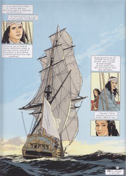 remarques: | à bord de la "Méduse", on commence à s'inquiéter sur le sort de Yann de Kermeur alias l'Epervier disparu depuis 15 heures, tout le monde le croit mort alors qu'il est mis à la question par les sbires de la comtesse de Sévérac >> p. 5 la marée est descendue (voir tome 7 p. 46) mais l'Epervier sort ses griffes et réussit à se libérer lui-même >> p. 10 la marée est remontée et l'italien (all'inferno, all'erta, fuoco, bastardo, maledetto) est de rigueur lors de la fuite de l'Epervier qui malgré tout bien amoché sera sauvé grâce à la perspicacité de son mousse Gaël >> p. 4 et 18 les petits secrets du roy enfin rétabli, l'Epervier et la "Méduse" peuvent appareiller, mais avec un détour via Port-Louis sur la côte africaine >> p. 18 le secrétaire du ministre Maurepas: Joseph Pellerin >> p. 20 entretemps on apprend que la garnison de fort St-Jean au Canada a été exterminée par une bande de sauvages peaux-rouges dirigée par un diable casqué de fer >> p. 20 le suicide en couple >> p. 19 on fait durer le mystère avec qui? Il?, lui? (en lettre grasse) et afin d'empêcher l'Epervier à rejoindre le Canada, les comploteurs font même appel à l'amirauté britannique, tandis qu'à Port-Louis, l'Epervier doit embarquer de nouveaux passagers: - la princesse Mali, fille du grand chef Abénaki et ses 2 gardes-du-corps - le père Martin qui connait le dialecte des sauvages - le capitaine allemand Kurt Wagner - tandis que le guide-ivrogne Villéon essaie de se faire la malle après avoir évité deux frégates anglaises qui s'apprêtaient à prendre la "Méduse" en tir d'enfilade, la traversée vers le Canada s'effectue sans histoire, mais la comtesse de Sévérac n'a pas désarmé et envoie son spadassin Ricardo au Canada pour éliminer définitivement l'Epervier >> p. 40 dernière page: une belle illustration de la "Méduse" >>> un album décevant, Pellerin est bien meilleur dessinateur que scénariste, en fait Pellerin fait vraiment durer le voyage vers le Canada (semblable au tome 5 du 1er cycle pour le voyage vers Cayenne) avec un texte plutôt faible et peu enrichissant |