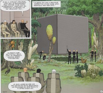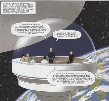 remarques: | prologue et petit résumé par Leo sur les voyages de Kim Keller: mondes d'Aldébaran, Bételgeuse et Antarès avant de monter dans la navette extra-terrestre avec Alexa, Kim se débarrasse de Jedediah Thornton >> p. 10 la méthode radicale d'Amos pour réveiller Ashley entretemps, une inondation ravage le camp de base sur Antarès (= petit interlude pour faire durer le récit) tandis qu'Amos et Suria sur Antarès4 cherchent à contacter les extra-terrestres, en l'occurrence Sven (une ancienne connaissance) et Eltven qui ne réagissent toujours pas >> p. 16 le transport de l'infirme par l'infirmière Darlène dont le vieux Pad tombe amoureux >> p. 20 retour à 47 minutes auparavant (deux mêmes cases que sur p. 9!) où l'on retrouve maintenant, après quelques voyages inter-temporels, pour de vrai: Lynn, fille de Kim et Mei, soeur de Zao et finalement tout ce petit monde est de retour à la navette sur Antarès4 avec Amos et Suria et >> p. 26 bien sûr Kim pleure à nouveau mais maintenant les extra-terrestres, Sven et Eltven (= noms peu extra-terrestres mais plutôt scandinaves) se manifestent enfin >> p. 31/32 les explications de Sven: Jedediah est traité de spécimen terrien rétrograde et la fameuse sphère serait une création d'autres extra-terrestres aujourd'hui disparus mais qui auraient conçu la sphère comme laboratoire d'analyse pour de futures explorations inter-spatiales (petite supposition gratuite de l'auteur!) mais surtout Eltven explique à Kim que sa fille va subir prochainement de nouvelles mutations qui ne pourront être traitées que sur la planète de Sven et Eltven, Kim devra donc se séparer pour quelque temps de Lynn et c'est son père Sven qui s'occupera de Lynn, mais Kim pourra la visiter >> p. 36 le suicide de Jedediah et discussions sur le fanatisme retour au camp de base et rencontre entre les terriens et les tsaltérians (= le peuple de Sven), ceux-ci refusent de se montrer officiellement sur la terre mais propose d'ouvrir un centre de rencontre scientifique dans l'espace (Antarès5) le groupe scientifique terrien doit impérativement être dirigé par Kim qui choisira elle-même ses collaborateurs tandis qu'Alexa et son compagnon de première heure, le prof. Driss Shediac, seront les ambassadeurs de la terre sur Tsalta tout en coopérant avec les tsaltérians pour étudier le comportement et les effets des mantrisses >> p. 41 les femmes (deux terriennes, une tsaltériane et un tsaltérien = 3 sur 4) sont favorisées pour cette première rencontre extra-terrestre (n.b. comme d'ailleurs dans tous les récits de Leo) Marc quitte Kim pour Maï-Lan tandis que Kim commence une novuelle vie avec Amos et Lynn c'est aussi la porte ouverte pour de nouveaux cycles par Leo >>> fin du troisième cycle celui d'Antarès le début de l'album (première moitié) est quasiment sans intérêt (à part les amours de Pad et Darlène!!), seule la fin présente un début de nouvelles aventures qui pourraient être prometteuses avec les explications de Leo sur l'existence et la co-habitation avec d'extra-terrestres plus évolués que les terriens et les raisons pourquoi ceux-ci ne désirent pas entrer en relations directes et officielles avec la terre n.b. réflexions (discussions avec Leo) 1/ sur la série "mermaid project" ou comment serait le monde après une guerre catastrophique 2/ ses histoires comprennent principalement des héroïnes donc des femmes comme personnages principaux 3/ des paysages brésiliens dans ses récits (Leo a passé son enfance au Brésil) qui ont servi de base pour les dessins des séries de science-fiction |