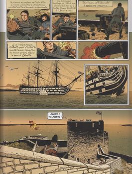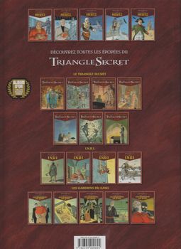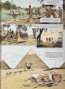 remarques: | page de garde: le serment de Guillaume II, duc de Normandie en 1066, bénie de Dieu le tout-puissant et une bonne préface par Thierry Lentz, directeur de la fondation Napoléon 1821, rocher de Gibraltar où André Hertz, le fidèle de Napoléon, s'attaque tout seul à la forteresse pour libérer le passage du détroit gardé par un navire de guerre anglais (en le canonnant depuis la forteresse) afin que Napoléon, enfui de l'île de Sainte-Hélène, puisse rejoindre l'Egypte pour prendre contact avec les forces spirituelles désignées par Ali (= Rostand, mameluk de Napoléon) rétrospective sur la fuite de l'empereur et de la poursuite engagée par Hudson Lowe pour le rejoindre sur les conseils de Louis Hertz, frère d'André, dont les enfants sont tenus en otage et menacés de mort par Hudson Lowe >> p. 14/15 grâce à son sous-marin fultonien, André Hertz endommage le navire de Hudson Lowe qui perd la trace de son gibier arrivée en Egypte de l'empereur qui prend la destination de Deir-el-Medineh, rencontre avec le grognard Ménart, survivant de l'expédition d'Egypte, qui reconnait son empereur et lui offre ses services comme guide à travers le désert >> p. 21 le sphinx et les trois grandes pyramides le groupe est attaqué par des bédouins pillards mais épargné grâce au talisman reçu d'Ali alors que Hudson Lowe a déjà entamé une poursuite sur la terre d'Egypte on arrive dans la vallée du mal rouge (= des lépreux), continuation par la place de vérité >> p. 29 le prix du passage: un baiser sur les lèvres d'un lépreux Napoléon est englouti dans une poche de fesh-fesh (sable mouvant) et rejoint les initiés alors que la troupe de Hudson Lowe est refoulée par une tempête de sable (= le souffle d'Osiris) >> p. 36/37 la légende d'Osiris, d'Isis, de Seth et d'Horus Napoleone di Buonaparte meurt pour renaître dans le cercle des initiés en buvant le sang noir conservé du coeur d'Osiris tout comme l'avait vécu Khounaton le pharaon et Jésus le nazaréen Napoléon porte désormais le nom de H'Qyt = le servant, il pénètre la chambre du milieu qui recèle le coeur de la connaissance et du destin restent André Hertz et Ménart qui doivent maintenant affronter seuls les sbires de Hudson Lowe mais grâce au message franc-maconnique laissé par André à son frère Louis (>> voir p. 19), ceux-ci échappent à Hudson Lowe en lui donnant rendez-vous sur la plaine de Waterloo pour une dernière confrontation où tout le monde périra sauf la fille de Louis Hertz qui restera le seul témoin de ce dernier drame napoléonien >> p. 54 le duel final entre les deux frères n.b. on ne saura toutefois pas le contenu du fameux message destiné à l'empereur (>> voir l'album précédent) >> probablement le dernier album de la série, toutefois un sixième album avait été annoncé sous le titre: "le secret d'Evariste Gallois", mais n'a jamais paru; dans le style du triangle secret, INRI et les gardiens du sang un récit romancé, mystique mais bien imaginé sur la fin de vie et le destin de Napoléon qui ne serait pas bêtement mort empoisonné sur l'île de Sainte-Hélène, une fin mystique assez intéressante bien que le massacre final ne soit pas particulièrement très convaincant, graphisme toujours encore acceptable |