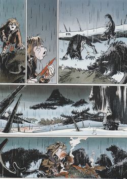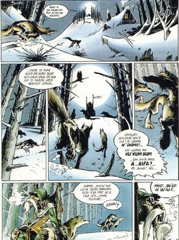 remarques: | dans un village de mineurs, on prépare la fête des brumes dont les trois sorcières: Ima, Awwa et Aïfa sont les fournisseuses attitrées, mais c'est le petit Dabriel qui reçoit les corvées à l'absence de Dabriel lors d'une corvée, le village et sa population sont exterminés par la bande de brigands de Voïvod le maudit, Dabriel est le seul survivant, mais avant de partir pour l'au-delà, la sorcière Aïfa ordonne à Dabriel de suivre la trace Dabriel est recueilli par Korfou, le magicien qui en fait son successeur en le nommant maître et gardien de la grande forêt et en lui apprenant le cri qui fera de Dabriel l'ami et le chef d'une meute de loups, ainsi commence l'histoire du soleil des loups >> p. 20 les soeurs de lune, toutes trois filles de la magie >> p. 23 Dabriel parmi les loups et Dabriel doit faire maintenant façe à une nouvelle obscure menace >> p. 25/26 l'arche de pierre naturelle d'où surgit l'attaque de la bande de Voïvod le maudit sur un ballon dirigeable après une poursuite effrénée, les assaillants sont défaits par des taupes géantes appelées à la rescousse par Dabriel après coup, Dabriel est confronté directement au Voïvod qui est éliminé par le cri de conscience de Dabriel, mais celui-ci retombe dans l'emprise des fantômes des sorcières de lune qui comme mères de la puissance veulent dominer Dabriel, celui-ci refuse de passer sous leur contrôle et pour leur échapper se transforme en loup >>> de l'heroic-fantasy à la folie surréaliste qui rappelle quelque peu la série Lanfeust de Troy, mais sans son brin d'humour et sans fil conducteur le texte est désordonné et pas très clair, le soleil des loups ne brille pas très fort sauf pour le graphisme fort original avec un trait et un coloriage bien exécutés pourtant la série, trop abstraite et artistique, ne pourra être lue qu'au deuxième degré n.b. primé à Angoulême en 1988 le soleil des Loups, premier volet de cette trilogie, avait déjà fait couler beaucoup d'encre le Creuset de la douleur, paru l'année suivante, fit l'effet d'un électrochoc: l'alchimie entre la narration et le dessin, le chassé-croisé entre le rêve et la réalité, ont bouleversé les canons de l'heroic fantasy et, plus généralement, de la BD contemporaine, un chef d'oeuvre parachevé 6 ans plus tard avec Saisons Voraces où, une nouvelle fois, le passé et l'avenir fusionnent grâce à la magie du dessin, une série culte (mais on se demande pourquoi) L'Enfant Loup, les 3 Sorcières et Sartana, mère de toutes les magies, sont les protagonistes de cette légende, le graphisme extraordinaire de Qwak apporte toute la puissance à cette grande série d'Heroic Fantasy |