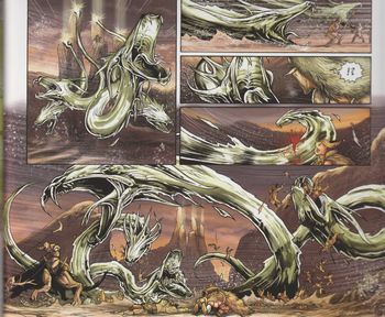 remarques: | à Asgard, une guerre se prépare l'origine du monde selon la légende nordique: de Ginnungagap le néant surgit une créature, la vache originelle Audhuma dont les pis laissent s'écouler quatre fleuves de lait de l'un apparait le titan Ymir qui donne naissance à la race maléfique des géants alors que de l'autre fleuve paraissait la race des dieux les deux races se déclarèrent la guerre, les géants vaincus se réfugièrent sur une terre hostile, le Jotunheim alors que les dieux avec Wotan comme maître créèrent leur propre monde, Asgard >> p. 13 l'histoire des survivants des Nibelungen à Nibelheim, anéantis par un gigantesque dragon seul leur général survécut et les hommes murèrent à jamais les chemins qui reliaient Nebelheim à Mannheim (terre des hommes) la guerre reprendra entre les hommes et les Nibelungen, les hommes les plus valeureux morts au combat seront envoyés au Walhalla renforcer l'armée de Wotan pour le combat final: le Ragnarök entretemps Albérich vaincu par Wotan, revient à la surface et demande à son frère Mime de récupérer l'anneau en s'emparant de Siegfried, seul personnage capable de battre le dragon Fafner qui détient l'anneau >> p. 32/33 l'apparition d'Albéric >> p. 41 conformément à l'ordre de son frère, Mime enlève Sieglinde, enceinte de Siegfried du village où elle s'était réfugiée >> p. 44 l'accouchement de Sieglinde dans la caverne de Mime Mime s'empare alors de Siegfried à sa naissance et abandonne Sieglinde à son sort >> un album reprenant toujours en partie les thèmes des légendes nordiques avec un graphisme toujours encore respectable |