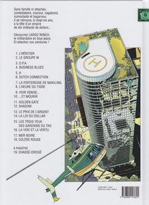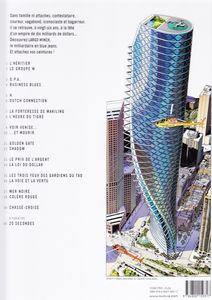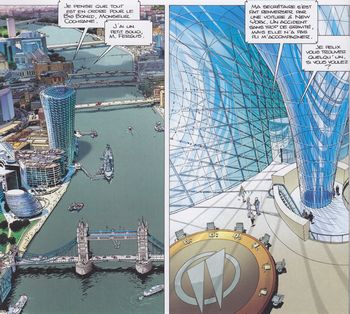remarques: | notes: - rupture avec la série précédente, le format de l'album s'agrandit, mais le nombre de pages (48) reste le même, par contre les 4ème plats sont remaniés et présentent maintenant le nouveau Winch building, the Tower Mansion à Chicago (l'ancien à New York a été vendu à des investisseurs qataris, plus élancé, plus moderne mais sans grande piscine sur la terrasse, à comparer avec l'ancien) - sur les pages de garde, il y a maintenant deux postes vacants - pour la première fois dans ses aventures, Largo séjourne à Londres à Londres, un vieux couple, les Banks, sont tués dans une explosion de gaz (probablement organisée par un groupe terroriste, voir plus loin), à Fiumiano, aéroport de Rome (pourquoi pas de Venise?) Domenica Leone, la sculptrice, fait la connaissance d'une jeune libanaise, Saïdée, qui se rend à Londres pour un stage et qui devait justement être logée chez le couple Banks, les deux femmes voyagent ensemble avec la Winchair à Hyères près de Toulon, Largo arrange un joint venture avec la firme aéronautique Draillac (coup d'oeil à "20 ans après" de Van Hamme) pour pouvoir pénétrer le marché chinois interdit au groupe Winch (voir les 3 yeux du gardien de Tao) >> p. 7 le dernier prototype de la Winchair: le Mowgli 3 à décollage vertical les Banks n'étant plus de ce monde, Domenica s'occupe de Saïdée >> p. 9 la Rolls Roye immatriculée JH 007 VL >> p. 11 Largo, Cochrane et Pennywinkle arrivent à Londres de retour dans le seul pays civilisé du monde dixit Pennywinkle et bien sûr sont logés dans le même hôtel que Domenica et Saïdée: le Royal Sword du groupe Winch par la suite, Saïdée, habillée secrètement en musulmane, (p. 12 la métamorphose de Saïdée) retrouve un groupe terroriste arabe qui s'intéresse à Largo >> p. 13/14 le portrait d'Osama bin Laden >> p. 14 les raisons pour lesquelles les terroristes veulent éliminer Largo Winch (n.b. parce qu'il prône un capitalisme à visage humain) >> p. 15 Largo = un multi-milliardaire de gauche (référence à Branson de Virgin airline) quant à Pennywinkle, elle rencontre un ancien camarade de classe amoureux d'elle >> p. 18 une Pennywinkle émue et désemparée tandis que Cochrane déniche une nouvelle secrétaire à son service 25 heures sur 24 et que Silky, manque de chance, fait la cour à un transsexuel masculin tout le monde couche avec tout le monde et certains sont des rabatteurs dont ceux qui piègent Cochrane et Pennywinkle, tandis que Saïdée attend son tour >> p. 26 les origines de Saïdée et de l'homme mystérieux (un russe ou un membre du groupe Winch) qui tire les fils derrière les terroristes >> p. 28 la galerie "divine woman" de Domenica et coup de théâtre, Largo tombe littéralement et subitement amoureux de Saïdée lors d'une rencontre à la galerie Domenica, tandis que la nouvelle secrétaire de Cochrane lui subtilise le dossier de la pile à hydrogène et le camarade de classe de Pennywinkle des documents confidentiels sur le groupe Winch, heureusement tous deux seront récupérés par le super héros Largo Winch >> p. 41 ah! l'immunité diplomatique mais Saïdée est en fait une agent de la CIA et dénonce ses amis arabes qui veulent faire exploser le lieu de la conférence big board tenu par Largo, toutefois le responsable CIA auquel Saïdaée s'adresse est un fonctionnaire corrompu qui travaille pour de mystérieux commanditaires qui veulent éliminer Largo et il ignore les avertissement de Saïdée allant même jusqu'à l'enfermer pour la garder tranquille, l'on apprend également que l'imam, chef des terroristes, travaille aussi pour la CIA, quelle salade >> un récit genre top model mode terroriste ou Juliette de mon coeur au parfum de rose, on est loin des intrigues économiques et financières de grand talent imaginées jusqu'ici par Van Hamme (lui-même agrégé d'économie politique), >> on sort des sentiers battus, la série bat de l'aile et même le graphisme de Francq est un peu moins élaboré annexes - couverture de l'album - 4ème plat de l'album et des albums précédents - vue de Londres - la salle de conférence big board au Royal Sword - une Pennywinkle quelque peu désorientée tout comme Cochrane |
