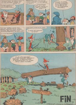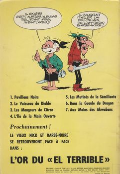 remarques: | dans son palais, sa majesté Auguste III cherche en vain son sommeil perturbé par des chants d'ivrognes dans la rue >> p. 9 l'ordonnance royale interdisant les boissons alcoolisées (donc plus de rhum pour les rhumes) mais cela ne touche pas Vieux Nick et Sebastien, son ami-harponneur qui sont tous les deux buveurs de lait entretemps, les Troublon (Barbe-Noire et son père Eustache) s'évadent du pénitencier et s'emparent de l'invention du prof. Periskoop: >> p. 18 un sous-marin sautillant, en forme d'araignée Vieux Nick et Sebastien avertissent sa majesté sur les dangers que peuvent causer ce sous-marin sur la flotte royale, mais sa majesté ne partage pas les craintes de Vieux Nick >> p. 24/25 les tracasseries administratives de plus, Barbe-Noire organise un trafic d'alcool dans le royaume, sa majesté enquête avec Vieux Nick et Sebastien, le débit clandestin est découvert, mais Barbe Noire et Eustache réussissent à s'enfuir et avec le sous-marin s'en prennent maintenant à la flotte royale, c'est un hécatombe, la flotte est pratiquement détruite, toutefois grâce à la ruse de Vieux Nick, Barbe-Noire et Eustache seront recapturés et condamnés à abattre les arbres nécessaires (543'252 troncs) pour reconstituer la flotte royale >> un récit comique sur le thème de la marine, le scénario vogue de toutes pièces, mais le graphisme est charmant avec un bon coloriage ce fascicule no 8 fait partie des 26 albums publiés sur Vieux Nick et Barbe Noire de 1960 à 1985 |