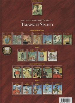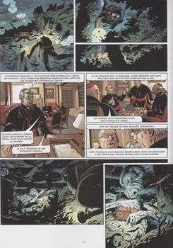 remarques: | début d'une nouvelle série, quelque peu la continuation des gardiens du sang avec le trio inséparable de Jean Nomane, le rectificateur, ses assistants: Karen, la morphologue et Mattei l'autiste = un ordinateur vivant nouvelle mission pour le rectificateur en Corée du Nord où le grand leader Cho Ihn Kyang a entreposé dans une cave secrète des tonnes de lacrima christi (une arme dangereuse) 11 mois plus tôt, en Méditerranée, des plongeurs travaillent pour le compte du Vatican (à nouveau les gardiens du sang de monseigneur Ghisolfo) à récupérer dans une épave le corps de l'alchimiste Biancofuori avec le coffret qui contient les larmes du christ (= une solution liquide = une terrible arme de destruction inventée par Biancofuori au Moyen-Age) mais les gardiens du sang se font court-circuités par Bencivenni, l'un des leurs, qui s'empare de la capsule contenant les larmes et qui se débarrasse de ses compagnons (n.b. les larmes du christ, c'est aussi le nom d'un vin napolitain: lacrima christi qui existe vraiment) le rectificateur (en fait Jean Nomane, le nouveau 007) agissant pour le triumvirat est mis sur la piste de Bencivenni n.b. on ne sait toujours pas qui est ce mystérieux triumvirat! et c'est le Vatican (le pape même) qui en est le commanditaire >> p. 16 le code noir = danger ultime donnant tout pouvoir au rectificateur (permis de tuer comme pour 007) tandis qu'au Caire, Bencivenni dissimule une capsule de lacrima cristi dans une molaire après avoir contacté la Corée du Nord au Vatican, le pape doit composer avec son ennemi de toujours: le triumvirat >> p. 21 le rectificateur devant le pape (qui lui est sous perfusion!) l'histoire secrète concernant la croisade de 1187 les croisés assiègent sans succès St-Jean-d'Acre, le pape Clément III fait appel à l'alchimiste Biancofuori pour une arme secrète >> p. 24 l'arme secrète inventée par Biancofuori = un gaz empoisonnant que l'alchimiste nomme les larmes du christ (c'est en fait un genre de peste tirée du sang vicié de rats, mais beaucoup plus puissant); le tout est confiné dans le document de Biancofuori: la "chronico finale"; Biancofuori voulut convoyer lui-même son poison à St-Jean d'Acre, mais son navire fut pris dans la tempête et coula en Méditerranée, Biancofuori y trouva la mort avec son coffret, toutefois son assistant Biondi survécut et put indiquer le lieu du naufrage >> p. 32 la bénédiction du pape au rectificateur et ses compagnons >> p. 34 la présidente du triumvirat qui au téléphone tient toujours un verre de champagne dans la main restait une question: qui est le frère à qui Clément III a adressé sa lettre? (page 30) interlude: le rectificateur reprend du service pour supprimer deux voltigeurs des gardiens du sang, mais cette fois il se fait surprendre par le cardinal Montespa (qui ne s'était pas manifesté durant la série précédente) et qui a repris les commandes des gardiens du sang, il dénonce maintenant l'activité de monseigneur Ghisolfo et de quelques autres gardiens dissidents d'avoir été complice avec Bencivenni, mais celui-ci a aussi doublé Ghisolfo et ses gardiens, Montespa offre alors au rectificateur de s'allier avec lui: les ennemis de mes ennemis sont mes amis >> p. 41 opération commando contre Ghisolfo et ses sbires entretemps, Bencivenni démontre à Wan, l'envoyé de la Corée du Nord, l'efficacité des larmes du christ en lançant eune attaque bactériologique sur l'aéroport JFK à New York d'autre part, lors de son raid et malgré que Ghisolfo ait réussi à s'enfuir, le rectificateur découvre la page manquante du "chronico finale" de Biancofuori qui annonce l'apocalypse (avec les larmes du christ?) et en arrivant à New York, Bencivenni extrait la capsule de sa molaire et par un comparse provoque chaos et apocalypse dans l'aéroport Kennedy; la preuve de l'arme fatale est faite pour la Corée du Nord qui pourrait devenir l'état le plus puissant du monde si elle reçoit de Bencivenni la deuxième partie de la souche du lacrima christi >> on est loin du charme des 3 premières séries du triangle secret, on sombre maintenant dans une affaire de terrorisme international où même la papauté s'y trouve mêlée, c'est le thème de la guerre bactériologique, de plus ni le texte ni le graphisme ne sont très recherchés, mais bien sûr l'imagination des auteurs n'est pas immortelle! toutefois le récit reste angoissant et bien trouvé n.b. on aimerait aussi bien recevoir des informations supplémentaires sur le mystérieux triumvirat - couverture d'album par André Juillard mais pas spectaculaire et qui reprend quelque peu la couverture du tome 2 (Deir el Medineh) des gardiens du sang - prochain album annoncé: à l'aube de l'apocalypse vocabulaire - eidétique = capacité à se rappeler d'un important nombre d'images ou de sons très précisément, à la façon d'une photographie - materner = traiter (qqn) comme le ferait une mère - vent coulis = vent qui se glisse par des fentes ou des clôtures mal jointes - palimpseste = parchemin dont on a effacé la première écriture pour pouvoir écrire un nouveau texte |