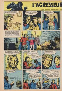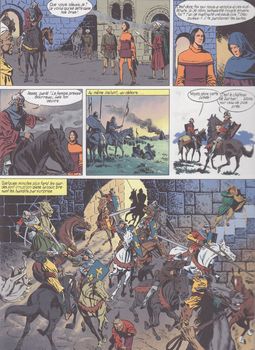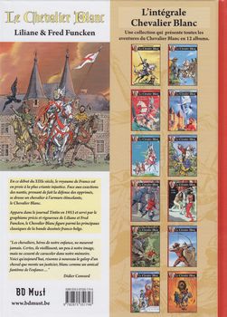 remarques: | réédition en couleur du 7ème épisode de chevalier blanc 30 planches parues dans Journal Tintin en 1960 + un ex libris collé en page de garde rencontre avec le chevalier Tancrède de Darnac, un croisé rentré de Terre Sainte, content de retrouver le chevalier blanc, Darnac vit retranché dans son castel, car il est menacé continuellement par des agresseurs inconnus, ce seraient des maures Dardemont a tôt fait de démasquer un traître parmi l'entourage de Darnac, mais malgré tout, un groupe de sarrasins dirigés par un mystérieux chevalier réussissent à pénétrer dans le castel et à s'emparer de Dardemont et de ses amis, le chef des sarrasins veut s'emparer d'un héritage dont Darnac serait le premier héritier, le maure s'apprête à supprimer ses adversaires quand un parti de chevaliers alertés par un membre de la garnison surprennent les sarrasins et délivrent leurs captifs, mais le chef réussit à s'enfuir Darnac et ses amis se lancent à la poursuite du rénégat, piste qui les conduit à Valladolid où Darnac reçoit un objet de valeur ainsi que des documents pour son héritage en Terre Sainte l'agresseur inconnu se manifeste à nouveau, il est démasqué, c'est Sifar de Tigrida, un parent de Darnac, mais il réussit à nouveau à s'enfuir nouvel affrontement en Palestine où Tigrida cette fois trouve la mort >> p. 31 et le bijou reçu par Darnac sera la clé d'une ouverture récelant un trésor brillant de mille feux >> à nouveau le thème de la chasse à l'homme et au trésor, une autre aventure du chevalier preux et blanc, mais une aventure quelque peu banale, tant pour le scénario que pour le graphisme annexes - couvertures 1er et 4ème plat de l'album - une page de l'édition originale - pages de garde - une page de l'album BDmust à noter la différence d'impression entre l'édition originale (journal Tintin) et les éditions BDmust (couleur) |