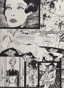 remarques: | livre première édition, en N&B, 160 pages prologue (O sans intérêt) de Marie-José Baudinet - une jeune femme est livrée aux caprices de personnes sadistes dans une maison isolée où l'on dresse les femmes, elle y deviendra une esclave sexuelle - toute la panoplie du sadisme y est représentée: viol, sodomie, attouchements, - supplices (surtout des flagellations), fellation, fétichisme, - liaisons lesbiennes, utilisation de godiches et cie, - bondage, mais heureusement pas trop de scatologie (se rapportant aux excréments) >> p. 13 la flagellation en zoom >> p. 21 des poses plutôt érotiques >> p. 30 du foie gras pour le dogue Rocambole >> p. 48 une partouze à quatre >> p. 97 le mont de Venus >> p. 110 le petit bustier >> p. 118 la pose des anneaux >> p. 124 le bondage >> p. 128 une belle paire de fesses - l'histoire d'O pornographique avec référence sado-masochiste à la mode des années 30 et à la sauce Crepax c'est tout à fait le genre Juliette de Sade - un texte pratiquement nul mais intéressant de par le graphisme particulier de Crepax, toutefois après avoir tourné la moitié des pages, le tout commence à devenir quelque peu lassant malgré les lacets érotiques - adaptation en bande dessinée du roman "histoire d'O" (O pour Odile?) signé par Pauline Réage (qui en est peut'être aussi l'auteur qui reste inconnu) roman publié pour la première fois en 1954 >> en bande dessinée par Crepax (1975) >> en film par Just Jaeckin (1975) >>> voir aussi Crepax cahier CBD no 52 sur Crepax annexes - couverture de l'album - planche extraite de l'album |