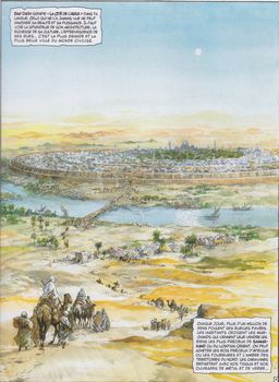 remarques: | les membres de la magie rouge, dirigés par Magon arrivent au port arabe de Saïda avec un Aniel qui a déjà bien grandi tandis que Thorgal fait connaissance avec Salouma qui lui raconte l'histoire des magiciens rouges de Bag Dahd >> p. 7 à 14 l'histoire des magiciens rouges création de la ville de Bag-Dahd = cité de l'aigle) où un jeune berger reçoit d'un djinn (Dji Hins) le grand livre de la magie rouge et devient ainsi le grand maître des magiciens, depuis lors, les grands maîtres règnaient au côté des califes à Bag-Dahd, mais plusieurs années plus tard, une discorde s'installa entre le calife et le grand maître, du nom de Kahilim, dût s'enfuir en prenant le nom de Kahaniel de Valnor et la légende s'établit que, à sa mort, Kahaniel serait réincarné dans son fils Aniel qui sauvera Bag Dahd de la tyrannie >> une histoire des mille et une nuits sur l'origine des magiciens rouges toutefois les magiciens rouges de Magon, arrivés à Bag Dahd, sont déjà surveillés par des inconnus (à la solde du vizir du calife?), les magiciens reprennent la "mer" sur les vaisseaux du désert, les inconnus essaient de s'emparer d'Aniel mais ne sont pas de force façe aux magiciens rouges entretemps Thorgal et Petrov arrivent aussi à Saïda et Lehla devient jalouse de Salouma >> p. 22 la règle de Petrov: ne jamais dire à une femme ce qu'il pense d'une autre femme >> p. 35 Salouma la nouvelle conquête de Thorgal arrivé à destination, Magon s'installe dans son repaire secret et prépare la cérémonie de la réincarnation arrivé à Bag Dahd, Thorgal mène son enquête et finit par trouver le repaire des magiciens rouges >> p. 46 Thorgal est repéré par les magiciens grâce à un périscope installé dans leur repaire souterrain Thorgal réussira à pénétrer dans le repaire et assistera à la cérémonie de réincarnation qu'il ne pourra empêcher et l'esprit de Kahaniel se réincarnera dans le corps d'Aniel >> p. 48 la cérémonie de réincarnation + en fin d'album, nombreux croquis et crayonnés par Rosinski dont des portraits de Thorgal >> toutefois le scénario de la saga tire quelque peu en longueur, l'imagination de Sente est mise à rude épreuve, peu de texte sauf pour le conte des 1001 nuits tandis que le graphisme de Rosinski est excellent (beaucoup plus recherché que les albums précédents) n.b. les aventures de Jolan sont temporairement oblitérées dans cet album, elles seront reprise dans la série Kriss de Valnor cet album est marqué 34bis première édition hors série, la première édition est daté 14.10., modifié le 24.10 avec une autre couverture d'album, album marqué 34bis avec 8 pages supplémentaires de croquis sur Thorgal à la fin de l'album, on trouve les nombreuses séries qui se basent sur Thorgal soit: - la série Thorgal prévue avec 36 albums dont en partie sur le personnage de Jolan dans les derniers albums - la série Kriss de Valnor (8 albums prévus) - la série Louve (7 albums prévus) - la jeunesse de Thorgal ( 6 albums prévus) + un album hors série "aux origines des mondes" annexes - couverture de la première édition hors série - couverture de la première édition normale - vue sur Bag Dahd - portrait de Thorgal (cahier graphique) |