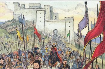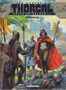 remarques: | Kriss gouverne le nord avec Phropor comme chambellan (l'ancien homme de main du prince Althar) et à Asgard, Kriss de Valnor fait valoir ses droits tout en gardant ses mauvaises habitudes malgré l'avertissement de la déesse Freyja que Kriss doit finir de se purifier >> p. 6 les conseillers (les sages) de la reine Kriss Kriss rencontre aussi le marchand Ierov qui la renseigne sur Thorgal et Aniel qu'elle désire ardemment retrouver alors que l'armée du roi Magnus et de son allié le duc d'Auxaterra se rapprochent de leur ennemi la première confrontation sera une victoire pour le roi-guérisseur >> p. 16/17 rencontre de Kriss avec Sologhonn, Kriss reconnait Jolan et chacun se raconte son histoire respective n.b. histoires d'ailleurs déjà bien connues des lecteurs de Thorgal >> p. 19 l'histoire de Kriss laissée pour morte au défilé de Ravinum (elle aurait été recueillie et soignée par Hildebrün) maintenant Jolan a reçu de Manthor de nouveaux pouvoirs (dont celui de guérisseur) et doit refouler les troupes de Magnus pour sauvegarder le monde des vikings, mais désormais Jolan va quelque peu tomber sous le charme de Kriss, ce qui inquiète ses trois compagnons (Draye, Ingvild et Xia), le quatrième Arlac, fils d'Auxaterra a rejoint son père, mais ne veut pas combattre contre ses compagnons n.b. il semble que Draye ait perdu son pied artificiel (page 48) >> p. 28 le camp militaire de l'empereur Magnus avec sa fille Gwenda qui a épousé en seconde noce Auxaterra et qui n'est pas en bon terme avec Arlac, Gwenda cherche donc à éliminer Arlac entretemps, Konoag, un noble viking veut trahir Kriss et servir Magnus pour prendre la place de Kriss, mais celle-ci grâce à Phropor apprend qu'il y a un traître dans son entourage, le traître est démasqué, toutefois ce n'est pas le véritable traître et Kriss reste donc toujours menacée sans le savoir pour sceller leur alliance, Kriss de Valnor propose d'épouser Taljar Sologhonn alias Jolan, le roi-guérisseur >> la saga continue, le scénario reste toujours intéressant alors que De Vita garde un graphisme très respectable annexes - couverture de l'album - le château de Kriss Valnor (ex libris joint à l'album) |