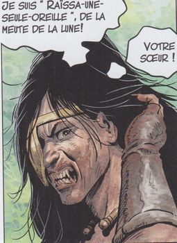 remarques: | Louve s'est encore échappée dans la forêt et mama Aaricia en rend Lundgen responsable alors qu'une mystérieuse femme borgne est à la recherche de Louve de retour chez elle, Louve constate qu'on lui a dérobé son trophée (un morceau de cristal de Fenrir) alors que chez les vikings, on retrouve une petite fille tuée par un loup, les villageois pensent que Louve en a été l'auteur (?) et avec Lundgen qui veut maintenant la peau (la mort) de Louve, ils se mettent en chasse >> p. 18 à défaut du cristal, Louve trouve la corne à baume de Thorgal >> p. 23 où l'on se rend compte que la femme Crow est >> p. 26/27 la réincarnation de Raïssa, la louve noire borgne Louve pourchassée rencontre un sauveur providentiel, Skald le guérisseur à la langue tranchée qui est devenu un grand homme >> tome 5 Slive (jeunesse de Thorgal) et qui quittera Louve un peu plus tard toutefois Louve recevra la compagnie de Yasmina, la guenon = une nixe après que la chouette automate Avrenim ait cessé de fonctionner Louve disparue, Lundgen fait croire à Aaricia que Louve est morte et maintenant Louve est traquée par Crow-Raïssia, la femme borgne, de la meute de la lune qui a rétabli son autorité sur une bande de loups >> le graphisme reste respectable avec un scénario toutefois un peu plus faible sauf peut'être l'apparition de deux personnages particuliers: la terrible Crow-Raïssa, une louve humaine et Skald, le bûcheron-guérisseur mais pourquoi Raïssia, une louve prend-elle le nom d'un corbeau? |