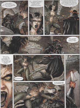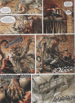remarques: | IIème cycle, série les chevaliers du pardon dernier album dessiné par Delaby décédé le 29.1.2014, il en était à la page 33 de l'album, le graphisme fut repris par son assistant Jeremy et la transition fut parfaite retour de Guinea Lord chez Saavarda, la mater obscura, qui règne sur les moriganes, Guinea Lord lui remet la tête de la fée Sanctus mais ce n'est pas la bonne tête, comme punition, Guinea Lord doit se battre contre une puissante morigane, il en sera vainqueur mais sera blessé pour se faire soigner, il retourne au château de sa mère, la dame à l'hermine >> p. 7 le château de Nothurland où Sill Valt l'attend, car il veut connaître les origines de Guinea Lord, mais Sill Valt est confronté à une tâche dangereuse ailleurs, des brigands commandités par Saavarda s'en prennent à Seamus chargé de la protection du marmot Sanctus, Seamus sera sauvé par une action psychique de la fée qui le quittera cependant pour un autre monde >> p. 21 le garde-chiourme de la dame à l'hermine >> p. 26 rencontre avec la dame >> p. 35 la préparation du destin de Sill Valt: son cercueil Sill apprend de la fille de la dame le nom du père de la fille, Frère Ashton, un chevalier du pardon qui avait choisi le mal et qui s'était accouplé avec la dame à l'hermine >> p. 39 la vraie nature démoniaque de la dame à l'hermine Sill Valt sera sauvé par le Guinea Lord qui veut faire cesser le mal et tue sa mère, mais lui-même grièvement blessé meurt et révèle son identité: c'est Guinea, fille de la dame et de frère Ashton toutefois Sill Valt empoisonné par une morsure de la dame à l'hermine ne survivra pas et c'est Cryptos qui pour se venger récupérera son âme quant à Seamus, il rencontrera à nouveau la fée Sanctus qui n'est autre que Laetitia, alors que Saavarda, la mater obscura, sans ses moriganes pour la défendre, sera assiégée par le peuple et devra s'immoler dans le feu mais elle se réincarnera dans ses fils du mal: Obla et Bedlam >> la plupart des personnages disparaissent dans ce dernier album du deuxième cycle, un récit qui finit bien mal ou mal bien mais en apothéose avec un superbe graphisme de Delaby (et Jeremy) qui restera inégalé par rapport aux prochains albums |