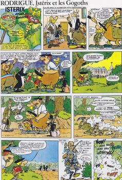remarques: | titre complet: les invraisemblables aventures d'Istérix, album pastiche préfaces entre autre par Salvador Dalix, Lady Dix et Bruno Coquatrix, définition de pastiche: le meilleur coup de chapeau à quelqu'un qu'on aime bien 1/ Chanteloup, alea jacta west (Obélix = Grasdunombrix) 2/ Rodrigue, Istérix et les Gogoths (en papier) 39-45 avant CDG (Charles de Gaulle) Astérix et les charentaises (pantoufles confortables) 3/ Nikolaz, dans un asile psychiâtrique 4/ C+D.Ray+Merezette, Istérix et Elliot Nix du FBX 5/ Coyote, le concours du lancer de légionnaires 6/ Merezette, it's a long way to typerarum les commandos Istérix et Omahabix 7/ Jaap+Joop, le château du roi Abralon 8/ Bontemps, la playmète de Halley, les astronautes Istérix et Bombélix à travers l'espace 9/ Tournaire, Obélar le bienheureux (la Genèse selon Obélix) 10/ Gégé, mon légionnaire (d'après Edith Piaf) 11/ D.Ray, Martelus et Falcicula (guerre froide, Berlin) 12/ Vruble, la galère des étoiles avec Cesarming le tyran et son homme de main Clak Dabor contre les agents Lukisterix et Yanobelix à la recherche du Super Boulinex 13/ C. Ray, Obelix-Frankenstein 14/ Papec, on ne marchera pas sur la lune avec Istérix, Mobilex et le directeur du centre spatial Uderzo 15/ Mysius, Istérix l'écolo >> un album-pastiche plutôt bien imaginé avec des auteurs/dessinateurs moins connus n.b. à considérer dans ce genre: - Baston, la ballade des baffes - Rocky Luke, banlieu west |