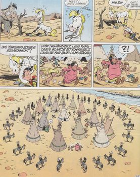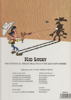 remarques: | surtitre Kid Lucky, pages de garde Kid Lucky 4ème plat: tout petit, il tirait déjà plus vite que son ombre (au lance-pierre) Old Timer, le vieux cowboy et le petit Kid Lucky (qui deviendra le fameux Lucky Luke) sont à la recherche de pépites d'or dans la région où vivent les castors roses à grandes oreilles (selon le whisky de Old Timer) ils ont d'abord affaire aux indiens Oglaglas qui sont friands d'eau de feu ethylique >> p. 7 le petit Kid Lucky aussi rapide au lance-pierre qu'avec le revolver plus tard enlevé par un peau-rouge et confié à la squaw gros mocassin, Kid Lucky sera rebaptisé porcelet braillard et devient le frère de porc-épic pâlichon, en cherchant à s'évader, Kid Lucky sauvera la vie à un jeune poney qui deviendra son compagnon célèbre: Jolly Jumper (traduction de l'auteur = sauteur magnifique, mais plutôt sauteur joyeux dirait-on) puis avant de retrouver son vieux père adoptif Old Timer, tous deux auront encore affaire aux tuniques bleues du colonel Costner, à des émigrants qui ont perdu leur fille et avec gros mocassin qui s'avère être la fille kidnappée du colonel Costner >> un début pas très fameux pour le jeune Kid Lucky on reprend d'anciens gags et histoires et le graphisme n'est pas encore très assuré n.b. classé sous Lucky Luke dans la Bedetheque |