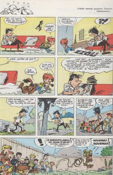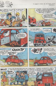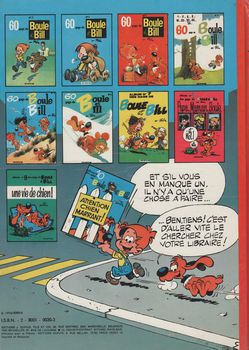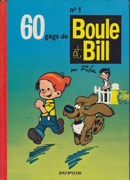 remarques: | biographie de Roba >> voir CBD no 16 tome 1 marqué 1975 en page de garde et 1970 au 4ème plat les aventures de Boule, le petit garçon et de Bill son chien avec la participation du papa de Boule et de temps en temps de la maman de Boule 60 gags dont les meilleurs en pages 6-11-14-17-22-25-31-43 et 52 >> p. 15 un monsieur Linguot, patron de papa Boule, qui ressemble quelque peu au De Mesmaeker de Gaston >> p. 49 la famille Boule en 2 CV >> des gags genre Modeste et Pompon, Gaston Lagaffe et Achille Talon, mais pas aussi recherchés que ceux de Franquin et de Greg, graphisme aussi dans le genre de Franquin, toutefois avec un peu moins de finesse, toutefois les histoires de Boule et Bill restent une des meilleures séries familiale européenne, un petit univers drôle et tendre créé dans Spirou en 1959 il y aura une trentaine d'autres albums dans cette série de 1962 à 2024 (dos ronds et dos carrés) n.b. curieusement, le tome 2 de 1964 (60 gags) édition originale, a été interdit par la censure française (?), modifié en 1965 et 1967 reprise de l'édition originale autres série de Roba: la Ribambelle seul le tome 1 de Bill et Boule est collectionné ici à titre d'exemplaire représentatif de la série Information Boule et Bill est une série de bande dessinée jeunesse humoristique belge, nommée d'après ses deux personnages principaux, créée en 1959 par Jean Roba, elle a été reprise en 2003 par Laurent Verron, puis fin 2016 par le scénariste Christophe Cazenove et le dessinateur Jean Bastide ils ont été rendus célèbres par le magazine de bande dessinée belge Spirou où ils apparaissent pour la première fois dans le numéro 1132, il s'agit alors d'une courte histoire imaginée en collaboration avec Maurice Rosy et Vicq, après deux histoires complètes, leurs aventures sont publiées en série sous forme de gags hebdomadaires, elles deviennent rapidement l'une des séries BD de jeunesse les plus populaires du monde francophone Boule et Bill ont fait l'objet d'une première adaptation en dessins animés (26 épisodes de 5 minutes) pour la télévision en 1969, puis d'une seconde diffusée sur TF1 en janvier 2005, enfin d'une troisième diffusée dans Ludo sur France 3 depuis le 23.1.2016 elle a aussi eu droit à une adaptation au cinéma en 2013 une statue de Boule et Bill, réalisée par le sculpteur bruxellois Tom Frantzen en juillet 2000, a été érigée, avec l'aide de la commune de Jette au Rond-Point Boule et Bill à quelques dizaines de mètres du lieu où a habité Roba durant plusieurs décennies la série raconte les aventures familiales d’un enfant de 7 ans, Boule, et de son chien, un cocker appelé Bill, sont aussi présents la mère et le père de Boule, Caroline la tortue, la voisine et son chat Caporal, etc elle se compose d'une série de gags, répartis en plusieurs albums, à l'exception de globe-trotters qui constitue une histoire complète, la plupart des gags se produisent dans ou autour de la maison, mais la famille part également en vacances, à la plage ou à la montagne personnages principaux: - Boule, un petit garçon à la chevelure rousse, est à la fois le maître et l'ami de Bill, son chien, il est toujours habillé de la même salopette bleue et d'un tee-shirt jaune, son âge (sept ans) n'est mentionné qu'une fois, le nom de Boule est inspiré du surnom Bouboule que le fils de Jean Roba, Philippe, avait à l'école parce qu'il était un peu rondouillard - Bill est un cocker anglais, qui, s'il ne parle pas aux humains, arrive à s'en faire comprendre au moyen de ses longues oreilles, qu'il peut orienter à son gré, ce qui donne lieu à divers gags, en revanche, il peut communiquer avec les autres animaux, notamment avec sa meilleure amie, Caroline, la tortue de la famille, il est très rusé et habile lorsqu'il s'agit de trouver de la nourriture, il aime dormir et monter sur le canapé, mais déteste les bains, Bill était le nom du chien de Jean Roba et en fait, c'est le personnage principal de la série - les parents de Boule sont les archétypes du père et de la mère, la mère de Boule, Carine, joue principalement le rôle de maîtresse de maison, par exemple en réparant les dégâts causés par Boule et Bill, à la fois ami et père, le papa de Boule (Pierre), essaye d'éduquer son fils en profitant de chaque occasion pour lui faire découvrir de nouvelles choses, malheureusement, il se retrouve souvent en situation difficile, trop sûr de son savoir et refusant d'avouer ses erreurs devant Boule, publicitaire, il travaille sous les ordres de Monsieur Coupon-Dubois et a pour mission de trouver des slogans pour des campagnes de radio ou d'affiches, il conduit une 2CV rouge - Caroline est la tortue de la famille, il s'agit d'une tortue terrestre grecque qui vit dans le jardin et dont la capacité à déterrer des os fait, au départ, peur à Bill, avant que celui-ci n'apprenne qu'elle raffole plutôt de la salade, depuis, les deux sont devenus les meilleurs amis du monde, leurs discussions sont souvent prétexte à une (légère) critique des êtres humains, Caroline est insomniaque et adore l'action, elle s'adonne au bobsleigh, à la balançoire et à bien d'autres jeux, on peut même penser à plusieurs reprises qu'elle est amoureuse de Bill - Pouf est l'ami de Boule, il ne pense qu'à jouer aux Indiens, au football et aux pirates, un peu boudeur, il ne voit rien à cause de la longue frange de cheveux qui lui cache les yeux, Bill ne s'entend pas toujours très bien avec Pouf et lui joue parfois des tours en 1999, la collection a été refondue: les albums, qui comportaient auparavant 64, 56 ou 48 pages, sont uniformisés en 44 planches, leur nombre passe ainsi de 21 à 24 et en 2008 ces albums trouvent des titres autre que 60 gags de Boule et Bill |
