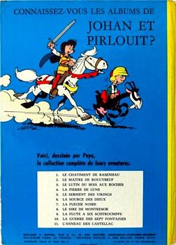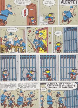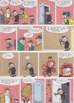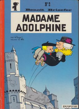 remarques: | réédition 1974 avec dos rond rouge Vivejoie-la-Grande, village de Benoit Brisefer, un petit garçon très fort et bien élevé mais qui perd sa force quand il est enrhumé il rencontre madame Adolphine qui veut bien jouer avec lui >> p. 10 monsieur le docteur suite à un évanouissement, Adolphine est récupérée par un citoyen et lors d'une nouvelle rencontre avec Adolphine qui ne reconnait plus Benoit, celui-ci n'y comprend plus rien jusqu'à ce qu'il découvre que la première Adolphine était en fait un robot, celle-ci s'échappe de son propriétaire et suite à une erreur de règlage, la gentille Adolphine devient une méchante et dangereuse petite vieille prise pour la méchante Adolphine, la véritable Adolphine est arrêté pour cambriolage >> p. 23 les explications de l'inventeur sur le robot Adolphine Benoit veut alors délivrer la véritable Adolphine qui a été emprisonnée à tort >> p. 33 Julot dit les belles mirettes quant à la fausse Adolphine (celle-ci entretemps a constitué une bande de malfrats)à elle), elle continue ses méfaits >> p. 41 la bande à Adolphine et son langage en argot finalement la fausse Adolphine sera récupérée par Benoit, puis rendue à son propriétaire (on ne peut emprisonner un robot) elle réussira encore à tromper son entourage >> un récit bien imaginé et au graphisme bien conçu par Will qui ne dessinera toutefois que les deux premiers albums de la série, le premier étant "les taxis rouges" (1962) >> non collectionné ici >> n.b. à ne pas confondre avec Prudence Petitpas, la vieille dame avec son chat Stanislas, série créée par Maréchal dès 1962 aussi >> voir Prudence Petitpas annexes - couverture tome 1 - couverture tome 2 avec extraits d'album - 4ème plat du tome 1 qui contraste avec tous les autres 4ème plats des albums suivants Information Benoît Brisefer est une série de bande dessinée jeunesse franco-belge créée en 1960 par Peyo dans le no 1183 du journal Spirou, Peyo va être épaulé par plusieurs collaborateurs aussi bien pour les dessins que pour le scénario, dont les plus fameux sont Will, qui créa les décors de la petite ville de Vivejoie-La-Grande, et François Walthéry, qui signera le graphisme de plusieurs histoires à la suite de Will en 1993, la série est relancée avec Pascal Garray au dessin et Thierry Culliford au scénario neuf histoires sont publiées dans Spirou dans les années 1960 et 1970 dont la plupart sont reprises dans les sept albums parus aux éditions Dupuis, après une longue interruption de la série, due notamment au succès des Schtroumpfs qui accaparent Peyo, elle est relancée par ses enfants après la mort de Peyo en 1992: six albums sont publiés jusqu'en 2004, puis un septième en 2015, aux éditions du Lombard la série met en scène un jeune garçon nommé Benoît Brisefer vivant à Vivejoie-La-Grande, qui a la particularité de posséder une force surhumaine qu'il perd néanmoins quand il s'enrhume, il porte toujours le même costume et un béret, avec son ami le chauffeur de taxi Jules Dussiflard, qui ignore tout de sa force, il vit des aventures policières, fantastiques ou encore d'espionnage, mais toujours teintées de poésie Benoît Brisefer, héros de la série, est un petit garçon, s'il ressemble à tous les garçons de son âge, il possède la particularité d'être doté d'une force surhumaine telle Superman (les raisons de cette force ne sont pas précisées), il peut soulever les charges les plus lourdes (une bétonnière, une armoire, une voiture), sauter très haut, courir très vite et a un souffle puissant, néanmoins, cette force est également un handicap pour lui, car il ne parvient pas à la contrôler, par exemple, il casse involontairement les jouets des autres qui, du coup, ne veulent plus jouer avec lui, et il se retrouve souvent seul, il a la particularité de perdre sa force lorsqu'il s'enrhume, ce qui arrive dans chaque histoire afin de laisser l'intrigue se développer, les adultes qui le prennent au sérieux lorsqu'il avoue sa très grande force sont rares; ils préfèrent souvent penser qu'il s'agit d'un mensonge enfantin ou qu'il y a un truc il a un oncle, Placide, membre des services secrets, de fait, aucune histoire ne mentionne ses parents ou des frères et sœurs, sa logeuse est une certaine madame Minou au début de l'année 1960, Charles Dupuis souhaite rapatrier dans le journal Spirou la série Poussy de Peyo, jusque-là publiée dans le quotidien le Soir, Peyo accepte, mais, fidèle, il souhaite refaire une série pour le quotidien belge qui a été le premier à lui faire confiance comme auteur de bande dessinée, de son imagination germe alors l'idée d'un petit garçon terriblement fort, qui perd sa force quand il est enrhumé, dénommé François Lebaucu, puis par la suite Benoît Brisefer apprenant le projet, Charles Dupuis veut absolument la série dans Spirou, Peyo, obligé d'accepter, crée encore une nouvelle série pour Le Soir, Jacky et Célestin, mais débordé par le travail, Peyo recrute comme assistant Will, ancien dessinateur de Tif et Tondu pour le journal Spirou, qui a passé deux ans au Lombard avant de démissionner, ce dernier est chargé de dessiner les décors de la première histoire de Benoît Brisefer intitulée les taxis rouges |