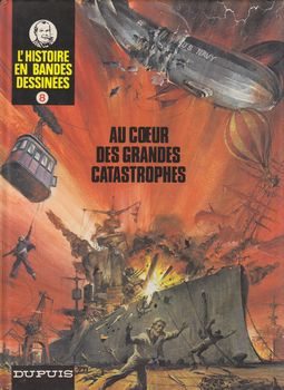 remarques: | titre complet: au coeur des grandes catastrophes scénario d'Octave Joly n.b. un album de ce genre se trouve aussi dans la série histoires de l'histoire 1/ épouvante à Mexico (dess. Fernan) les divers projets aéronautiques tel le dirigeable à ballons multiples, une sorte de locomotive aéronautique qui explosa à Mexico en 1851 2/ tragique lancement (dess. Cicuendez) le lancement d'un bateau était alors une opération risquée, réservée aux condamnés à mort deux catastrophes tragiques: a) celle du raz-de-marée causé par le cuirassé "Albion" en 1898 à Londres (Blackwall) et b) celle du paquebot "principessa Yolanda" qui se retourne lors de son lancement à Gênes en 1907 3/ un effroyable abordage (dess. Cicuendez) le plus tragique naufrage (avant celui du Titanic) du paquebot "Northfleet" qui sombre en 1873 dans la Manche après avoir été éperonné par un navire espagnol qui disparut sans se préoccuper des dégâts causés 4/ panique au théâtre (dess. Pascal) l'incendie dû à l'emploi de l'éclairage à gaz qui se déclancha au Ringtheater à Vienne en 1881 causant 700 victimes 5/ New York en feu (dess. Cicuendez) un incendie se déclare sur les docks et enflamment des tonneaux de whisky qui explosent les uns après les autres, cela devient une inondation incandescente de nombreux paquebots prennent feu, une grue maniée intelligemment sauvera la plupart des passagers du navire allemand "Dresden", mais les installations portuaires furent presque toutes détruites 6/ tonnerre sur Toulon (dess. Pascal) sur le dreadnought français "Iena" à Toulon en 1907, une explosion ébranle l'arrière du cuirassé et déclanche à son tour une forte explosion dans la soute des obus de 305 mm qui va faire des victimes jusqu'au centre de la ville depuis lors, on prit des mesures pour refroidir régulièrement les munitions entreposées dans les soutes des navires 7/ le saucisson infernal (dess. Pascal) le dirigeable-saucisson inventé par l'ingénieur Morrell en 1908 au USA, dirigé par 6 nacelles, chacune munie d'un moteur et qui explosa lors de son vol d'essai >> p. 36 le saucisson en chute libre 8/ quand la chance sonne deux fois (dess. Cicuendez) l'Akron (1931) et le Macon (1935), les deux plus grands dirigeables jamais construits (et dont l'un pouvait accueillir à son bord 7 avions = genre de porte-avions volant) sombreront tous les deux dans l'Océan Pacifique lors d'une tempête, mais ne causeront aucune victime 9/ les naufragés du téléphérique (dess. Cicuendez) lors d'une tempête de neige à Chamonix en 1971, deux bennes de téléphérique (l'une ascendante, l'autre descendante) se disloquent, l'une s'écrasera au sol, la seconde résistera et ses passagers seront évacués par hélicoptère >> des catastrophes peu connues, mais un dernier album de la série peu intéressant mais pas catastrophique, ni pour le texte ni pour le graphisme curieusement assez rare et donc bien côté n.b. la série des albums "histoire en bandes dessinées" aux thèmes différents se termine avec cet album no 8, les prochains seront des rééditions de biographies parues chez Dupuis dans les années cinquante tome 7 Godefroi de Bouillon (il avait été prévu un tome 7 avec comme titre "à l'abordage") tomes 9 et 10 Baden Powell, tomes 11,12 et 13 Surcouf le corsaire tome 14 Charles de Foucauld, tome 15 Mermoz, tomes 16 et 17 Stanley >> pour tous ces albums: voir biographie |