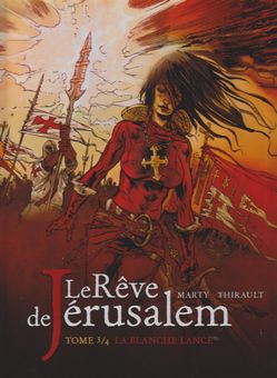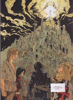 remarques: | à Antioche, les croisés se retrouvent eux-mêmes assiégés par une armée de 100'000 hommes commandée par le général Kurbuqa et levée par l'atabeg de Mossoul, la famine et la maladie frappent aussi les croisés, de plus la discorde s'installe parfois parmi eux >> p. 10/11 les têtes volent bas à Antioche toutefois Live Noir découvre que ce n'est pas la peste qui se manifeste, mais un empoisonnement dû à des aliments avariés et la rivalité pour Istvana s'installe aussi entre Live Noir et Hermance Bohémond de Tarente réussit à convaincre que tous les chrétiens (y compris les femmes et les hommes d'église) prennent les armes pour défendre les remparts contre l'assaut turc >> p. 17 à 19 la mêlée est générale Istvana, arrivée à la rescousse avec ses Tafurs sauve la situation le général turc use d'une autre tactique, il fait festoyer ses hommes devant les chrétiens affamés, mais ceux-ci résistent toujours et pour inspirer de la terreur aux turcs, les défenseurs se déguisent en Tafurs en fouillant dans l'église St-Pierre d'Antioche, Karlis découvre la relique de la lance sacrée qui avait percé les flancs du Christ, les hommes d'église refusent toutefois de reconnaître cette lance ébréchée et rouillée, Karlis l'a fait alors reforger et la pureté de son alliage, fait resplendir la lame de la lance qui devient l'arme du Christ: la blanche lance et avec cette arme miraculeuse, les croisés organisent une sortie et anéantissent l'armée turque, Antioche est sauvée mais Jérusalem est encore loin >> p. 47 Jérusalem, la cité des rois >> la saga de la marche vers Jérusalem continue, le scénario reste plutôt faible (>> p. 17 à 21 = 5 pages pratiquement sans texte) mais le graphisme bien que brutal reste bien exécuté n.b. les armures sont du XVème et XVIème siècle pour apparaître plus rutilantes (selon l'auteur) |