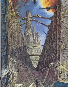 remarques: | album en hommage à Jacques Lob, fidèle partenaire et scénariste de Druillet, ainsi qu'au transperce-neige Chaos est une histoire du monde de Sloane qui se situe avant le scénario du long métrage Kazhann signé en 1987, mais après la série Salammbô de 1980-1986 Kazhann = 8ème planète du système de Shaan sur laquelle les barons bleus, la caste des divins collectionneurs, ont entreposé les trésors de leurs pillages et où les légions de Shaan ont reçu l'ordre de convoyer vers une destination mystérieuse le corps de Lone Sloane récupéré sur son vaisseau mystique O'Sidharta après son épopée avec Salammbô >> p. 3/4/5 la loco de transperceneige qui doit transporter le sarcophage d'or contenant la dépouille de Sloane vers la chambre mortuaire dont l'accès est contrôlé par un code secret uniquement connu de Shaan, ainsi le corps de Sloane sera mis à l'abri pour l'éternité afin de ne pas être utilisé comme symbole de résistance à Shaan mais malgré les précautions prises par Shaan, une chose (une femme) réussit à pénétrer dans la chambre mortuaire >> p. 29/30/31 le réveil de Sloane Sloane maintenant ressuscité et libre pourra continuer la lutte contre Shaan Sloane et sa nouvelle compagne (la maîtresse de la guilde des chants) doivent alors déjà affronter les forces de Shaan à leur sortie de la chambre ainsi que dans le train transperce-neige >> p. 36/37 qui roule dans la vallée du grand cargo >> p. 39/40/41 la symbiose entre Sloane et la maîtresse des chants (le visage de Madone et le cul de putain) >> p. 46 les barons bleus et la porte vers l'infini, la voie des chasseurs de trésor et avec l'aide des barons bleus et de leurs technosaures-machines, un autre monde est en train de renaître sans Shaan, ce qui permettra à Sloane et sa compagne d'échapper aux forces du néant >> un album dans la lignée du style Druillet, le charme des oeuvres premières n'opèrent toutefois plus aussi intensément, bien que le graphisme de Druillet reste toujours encore bien étoffé et étincelant de toutes les couleurs nombreuses références à des oeuvres BD ou autres symboles: >> p. 35 les statues de l'île de Pâques >> p. 39/40 la nouvelle Salammbô (qui fait l'objet de la couverture d'album) >> p. 56 le surfeur d'argent (silver surfer) et le texte se distingue toutefois du graphisme en étant vraiment chaotique |