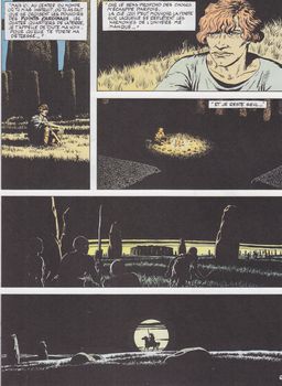 remarques: | un album imbibé de mystères celtes sur fond breton en connivence avec les éléments naturels (les 10 premières pages sont sans texte) discussion avec les 4 groupes tribales: - Grand Sud = le couple du soleil et de la chaleur, - Grand Nord = le couple du froid et du vent, - Petit Est = le couple de la lumière et des oiseaux - Petit Ouest = l'homme du tonnerre, de la pluie et du printemps = l'éveilleur du mouvement = l'initié >> recherches sur les origines de l'univers et la signification des races, album surtout philosophique, un retour de Simon du Fleuve peu fracassant après 10 années n.b. nouvelles pages de garde "en croisière sur l'océan" |