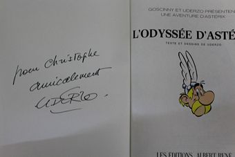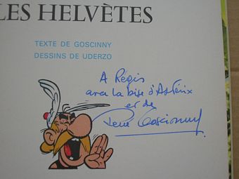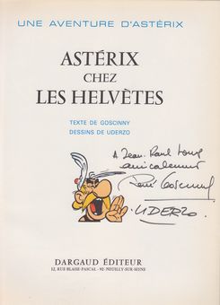 remarques: | album dans l'édition originale de 1970 dédicacé par René Goscinny et Albert Uderzo commentaires sur le texte, voir album tome 16 Astérix chez les Helvètes annexes: - dédicace de cet album par Goscinny et Uderzo - dédicace de Goscinny seul et de Uderzo seul pour comparaison avec d'autres albums - Goscinny avec l'album Astérix et les Helvètes |